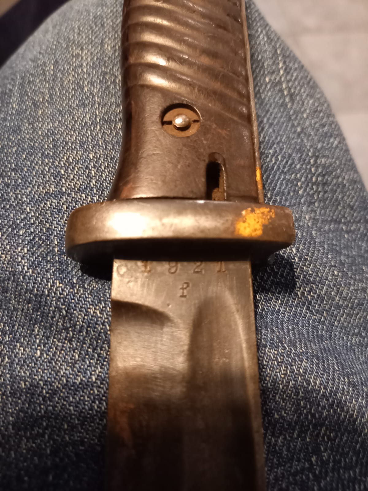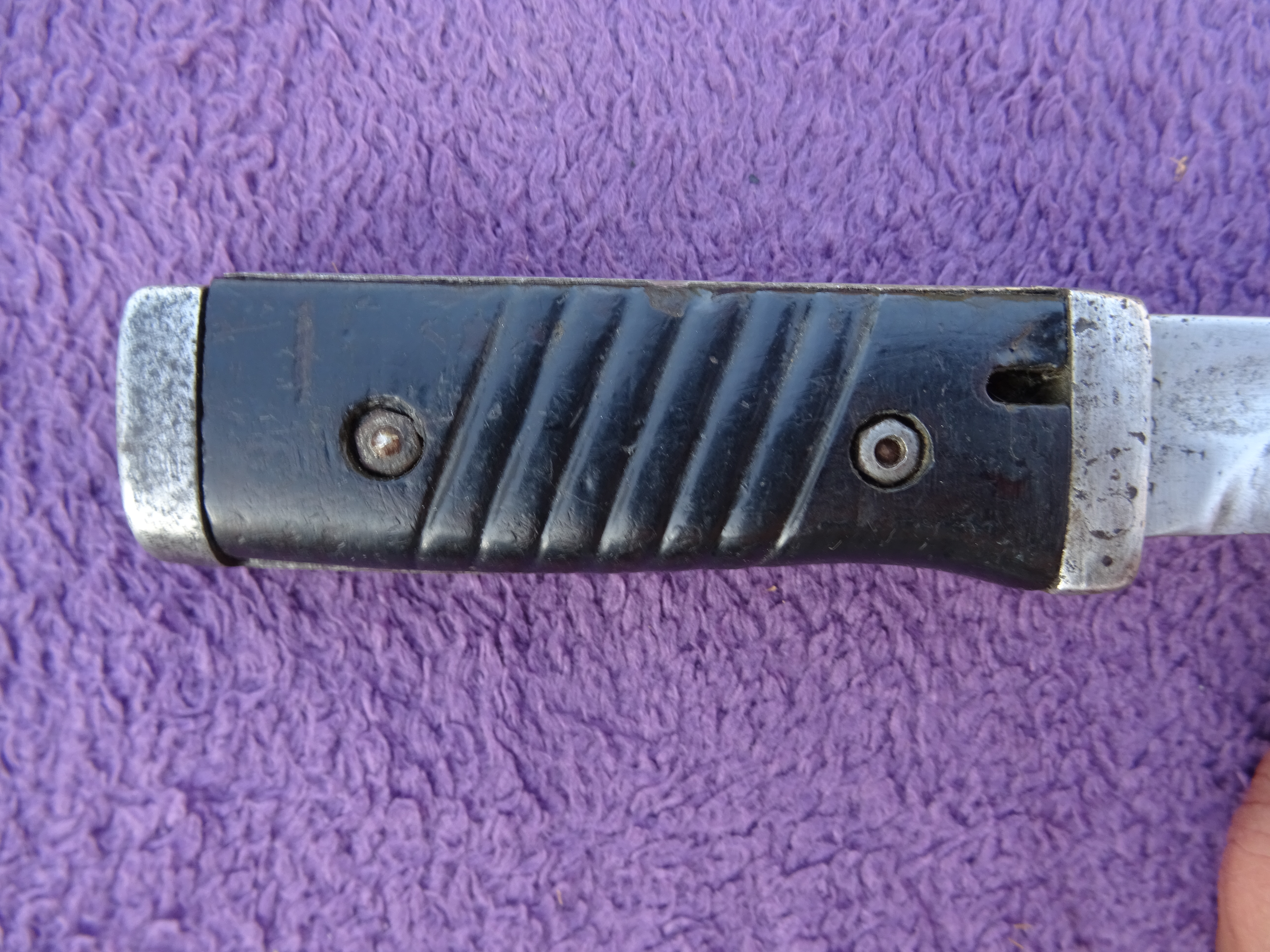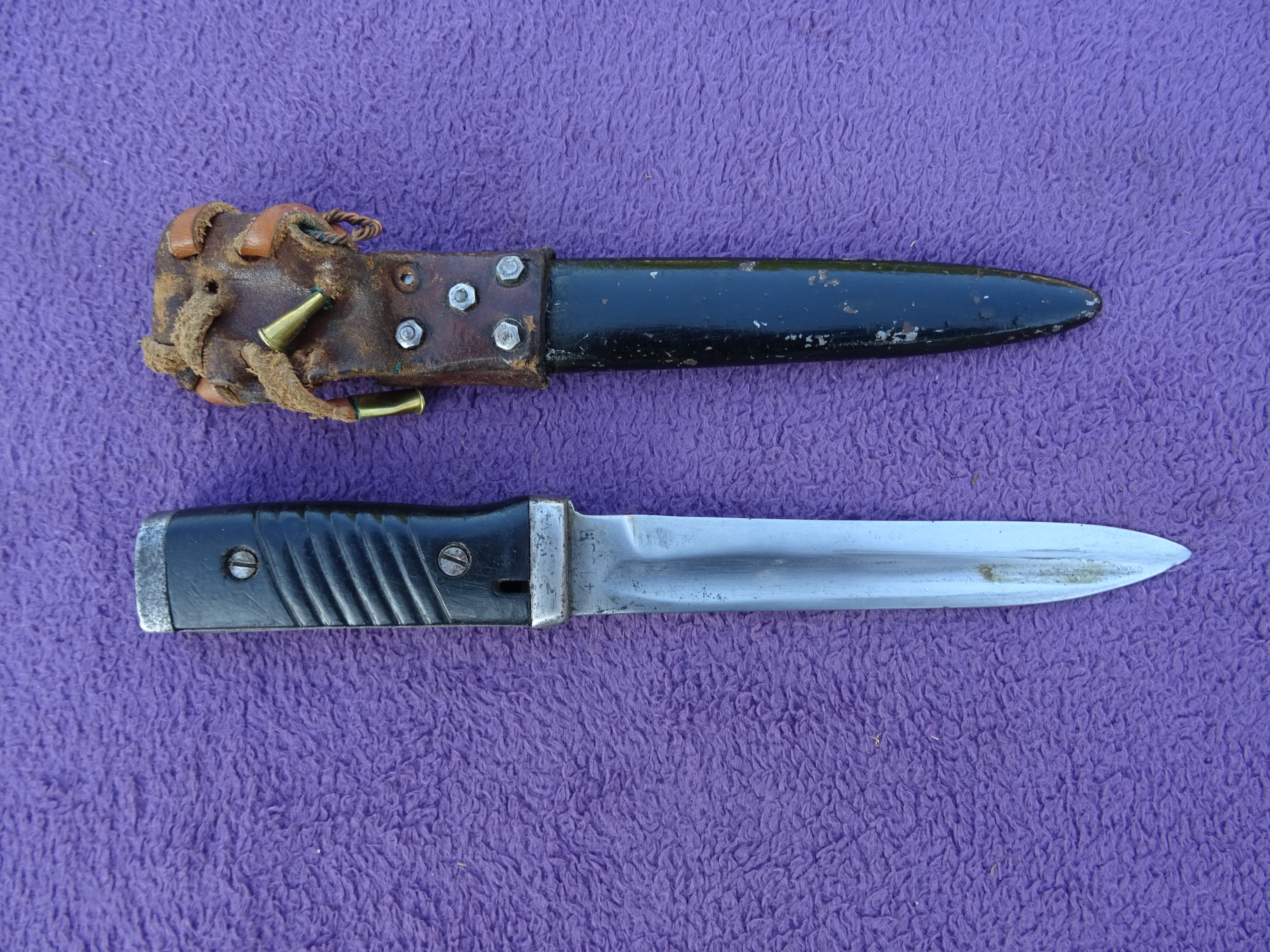 Przedwczoraj trafił w moje ręce kolejny bagnet, okaleczony w podobny sposób. Co ciekawe pochwa bardzo ładnie współpracuje z głownią.