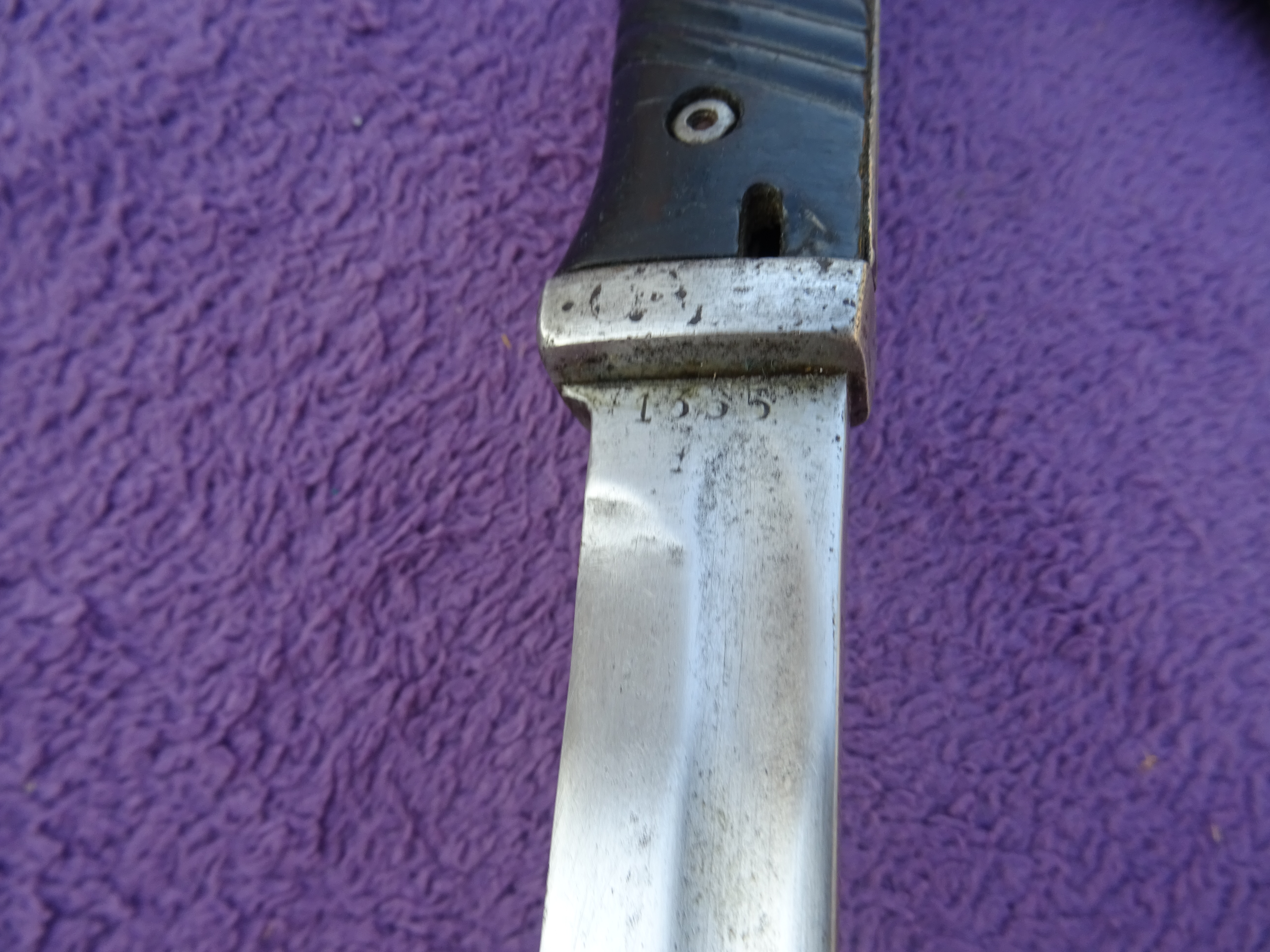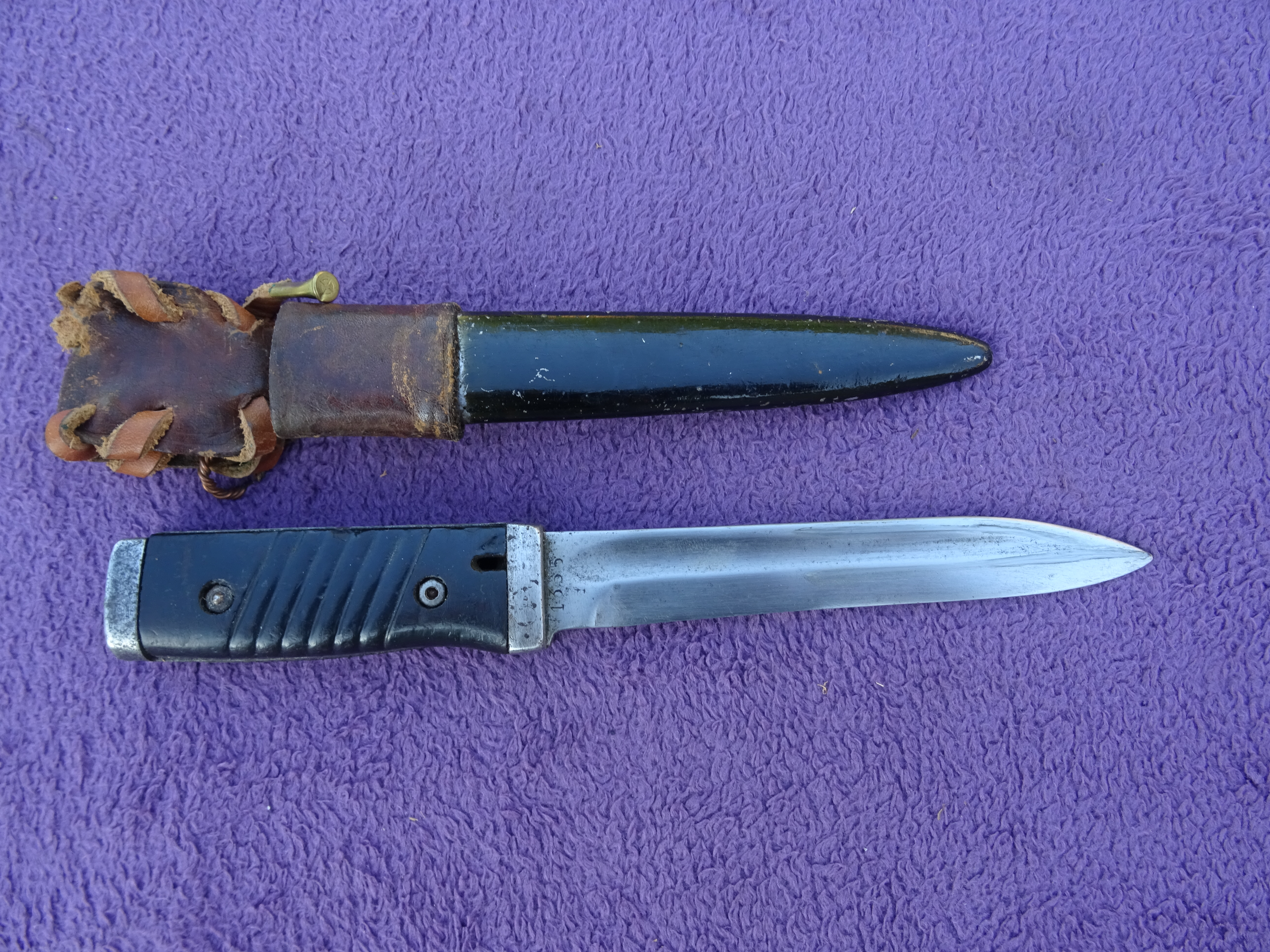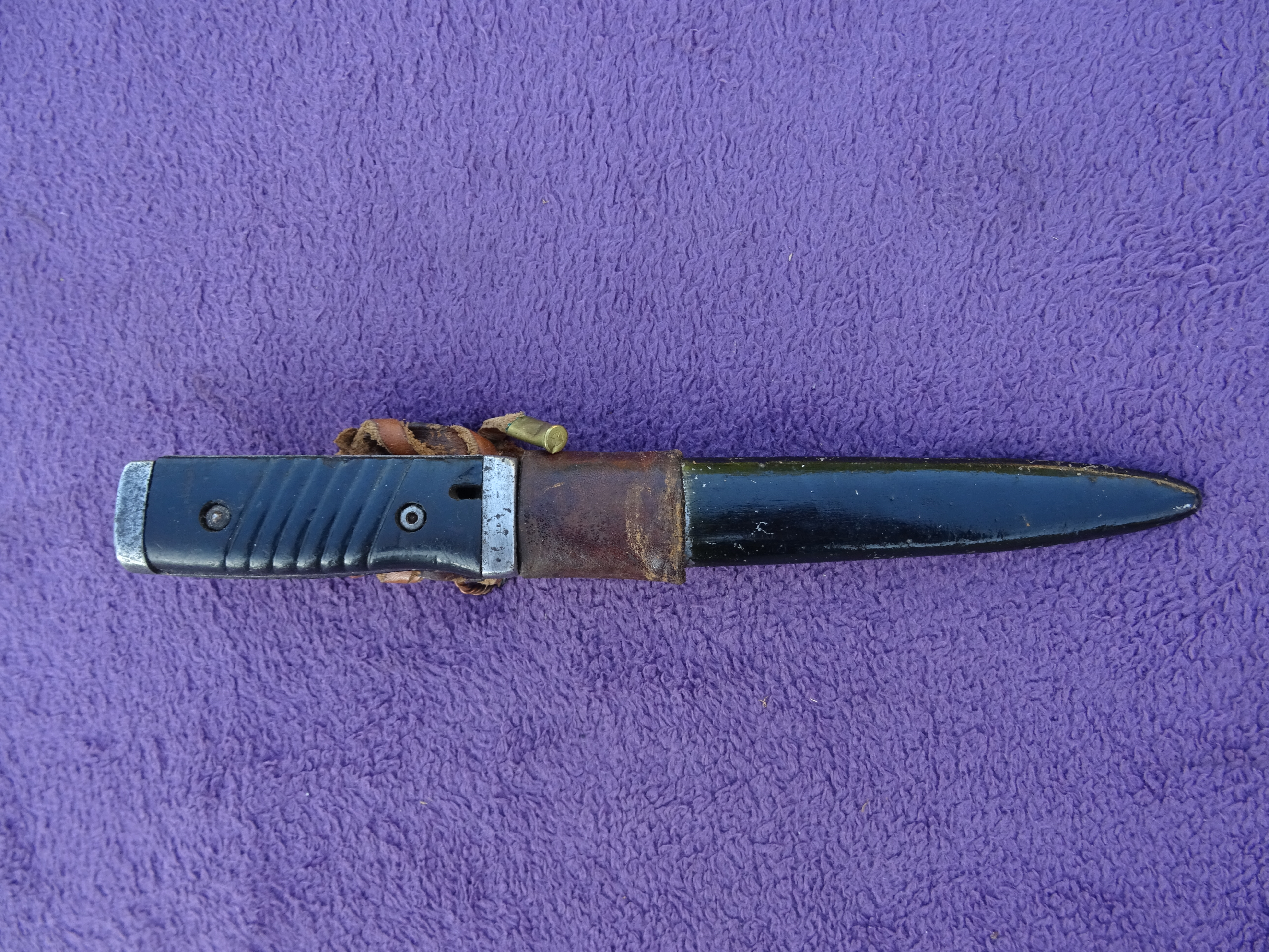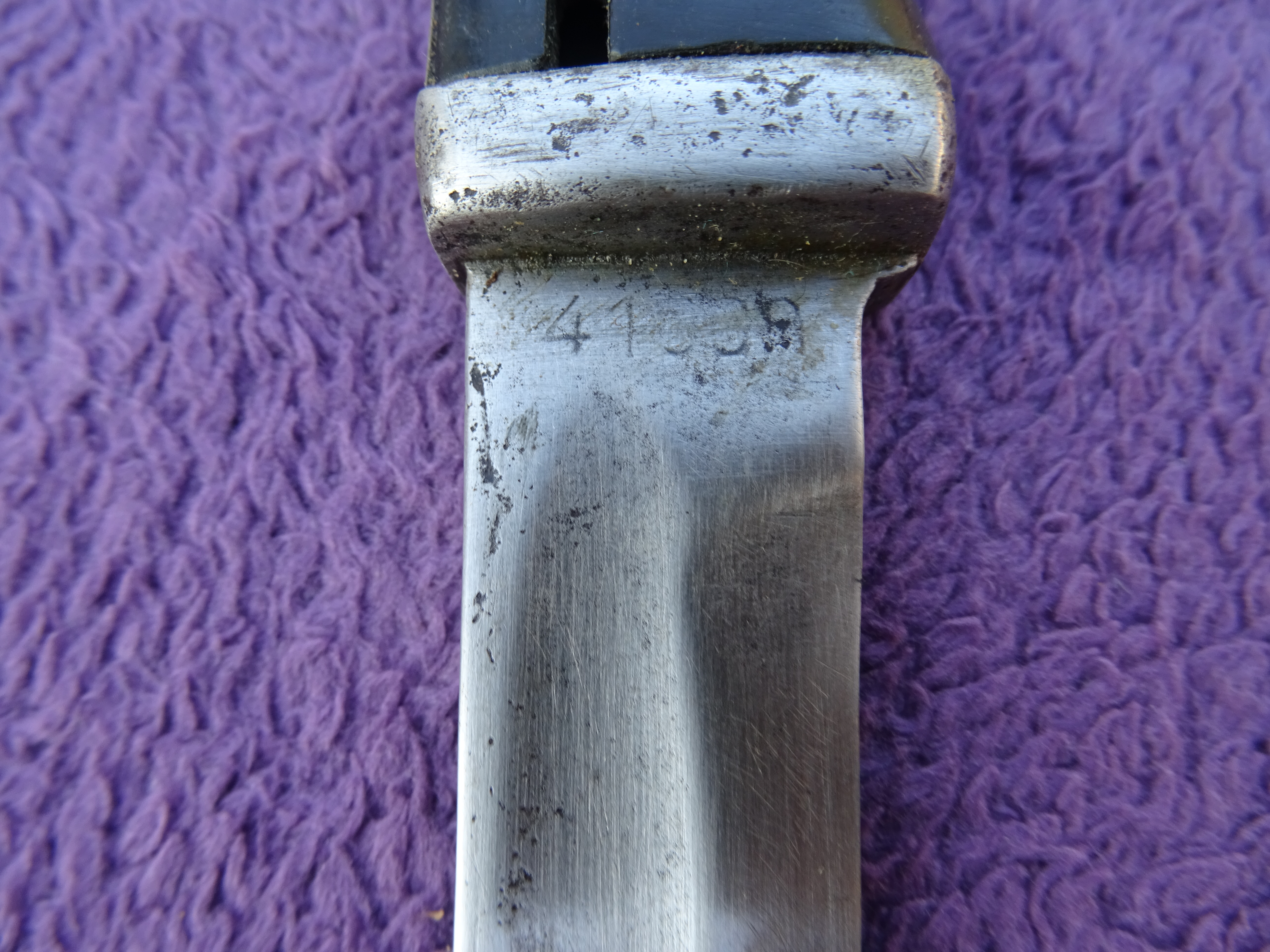 Przedwczoraj trafił w moje ręce kolejny bagnet, okaleczony w podobny sposób. Co ciekawe pochwa bardzo ładnie współpracuje z głownią.