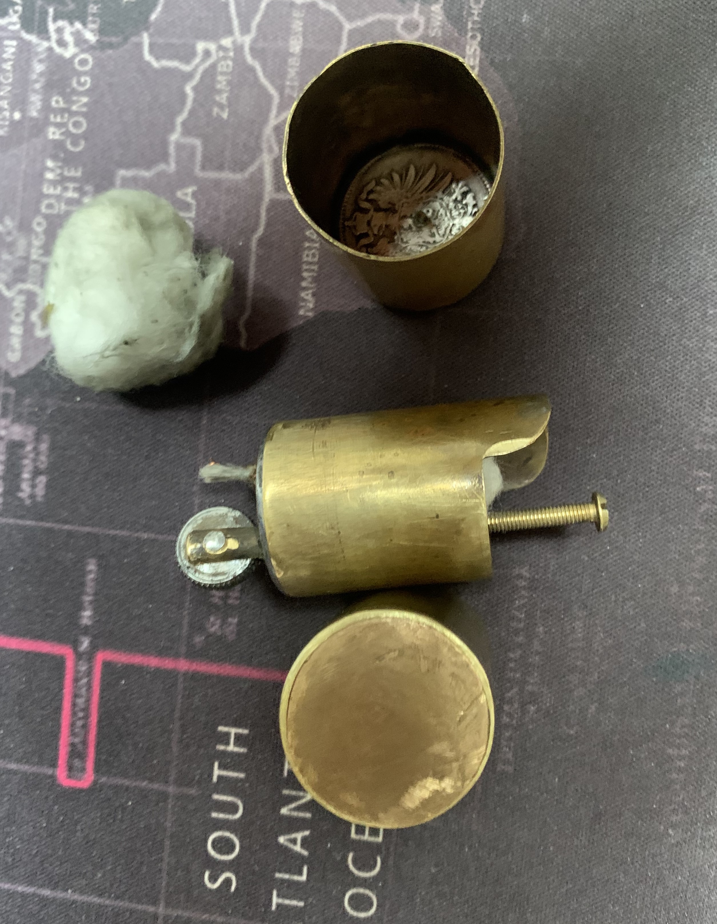 Druga francuska chyba 50 centimów Comerce Industrie (lata 20te XX wieku) - mosiądz lub brąz (?) przez nią przechodzi knot i rurka z krzesiwem.