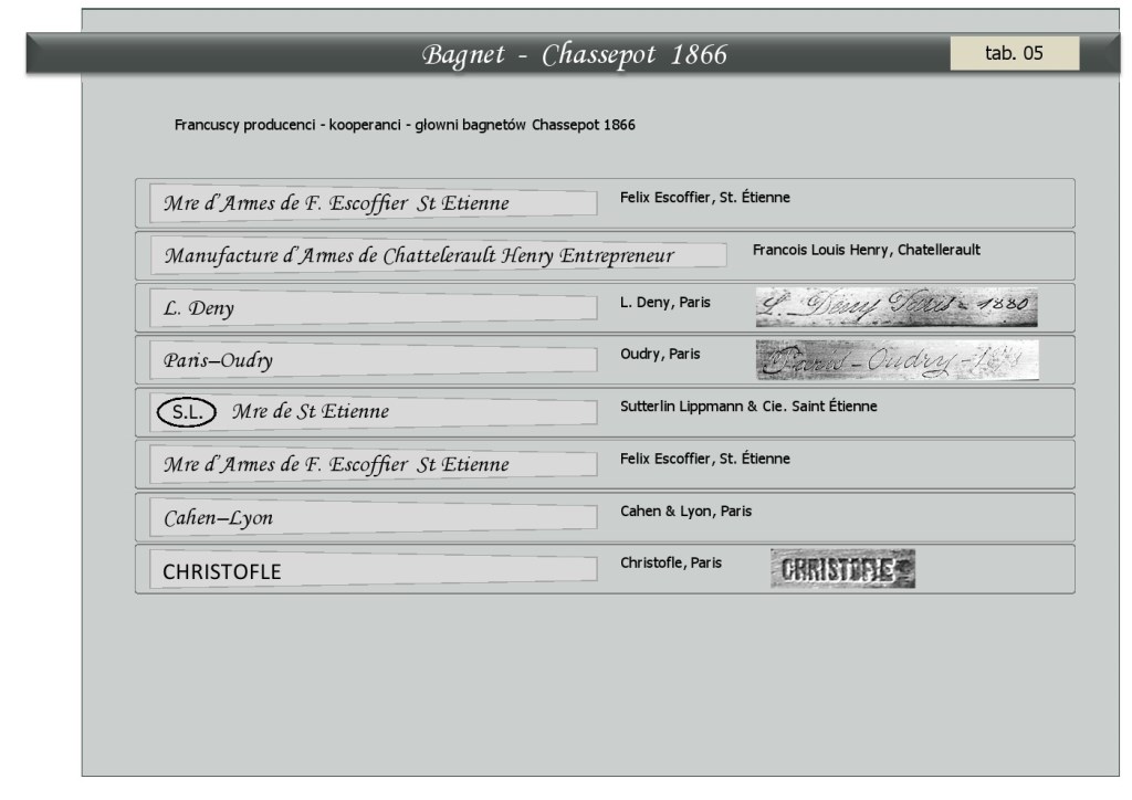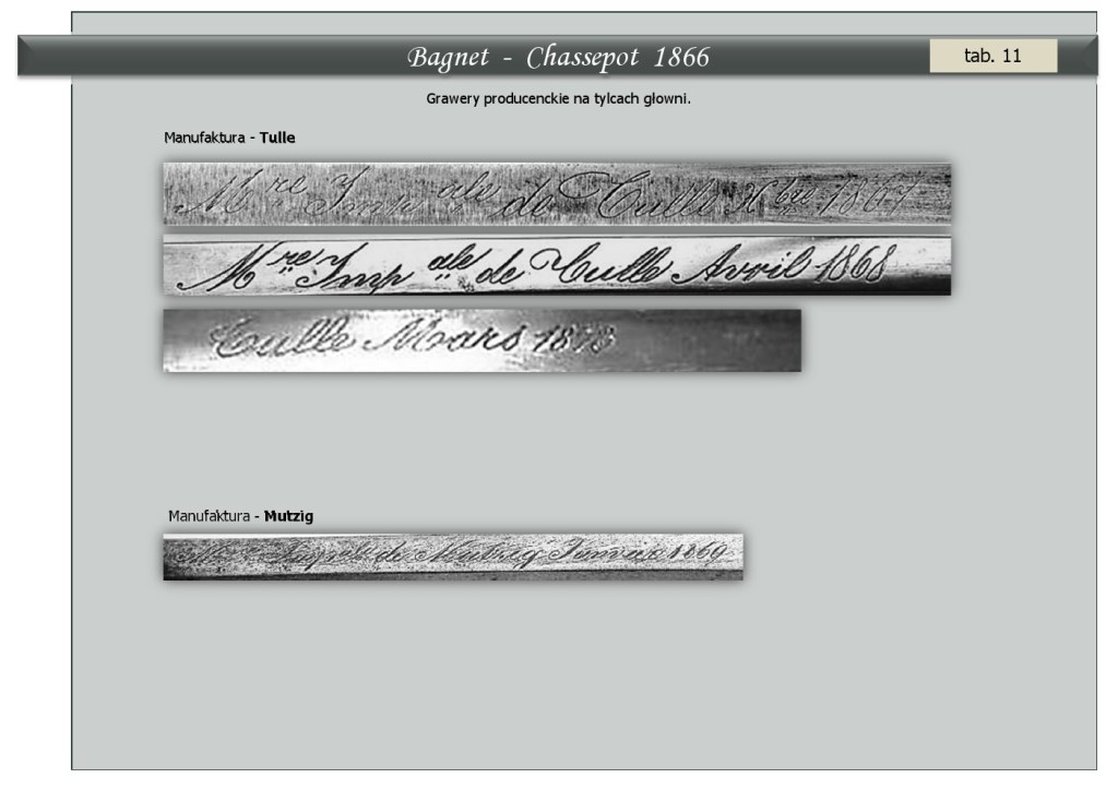 Chassepot Mle 1866 z Tulle wyprodukowany w 1874. Ja kupiłem taki z 1872 datą produkcji zapisaną w formacie łacińskim, dziesięciomiesięcznym - November - skrót „9bre”. Już dwa lata później w tej samej fabryce stosowano system nowoczesny gdzie luty występuje w kalendarzu "Février 1874".