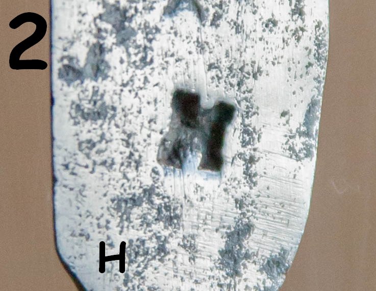 Świadczy o tym rodzaj wgniecenia puncy w stal. Środek "wygniecenia" litery jest zbyt wysoki jak na literę -H- nawet z szeryfami.