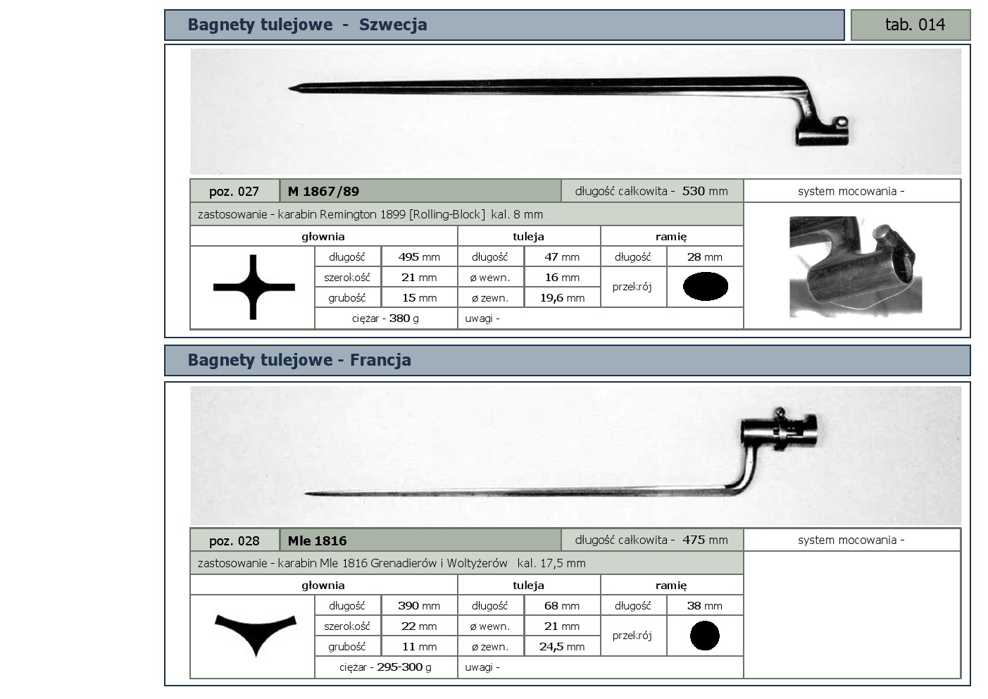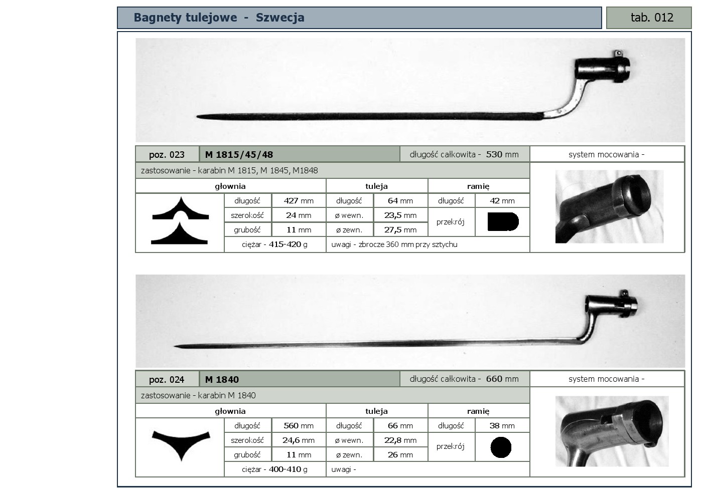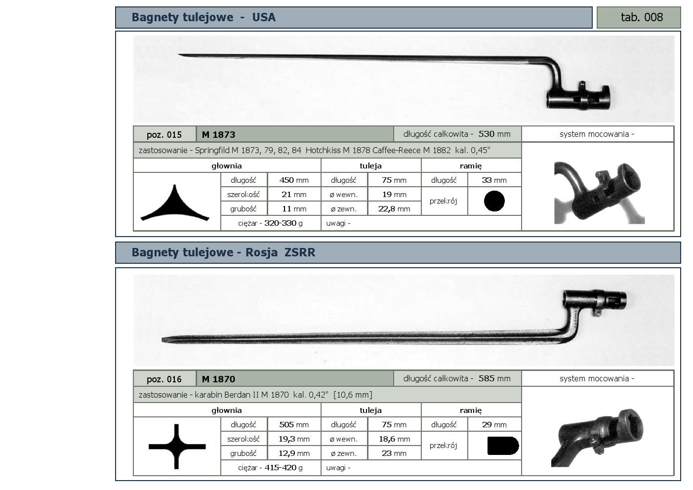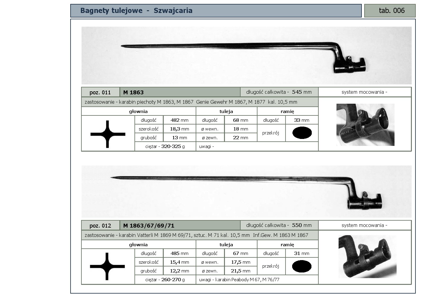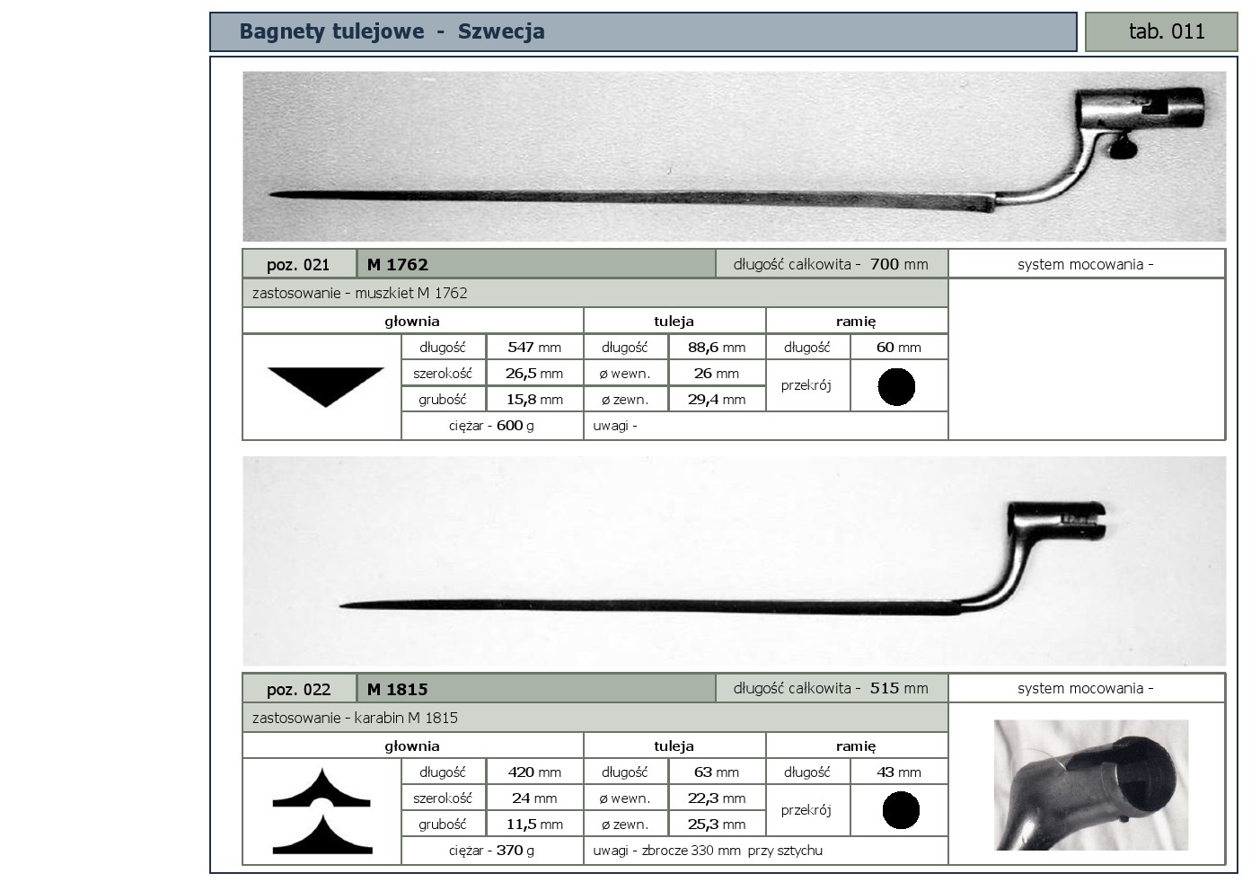 Tabele poglądowe bagnetów konstrukcji mocowania typu - tulejowego