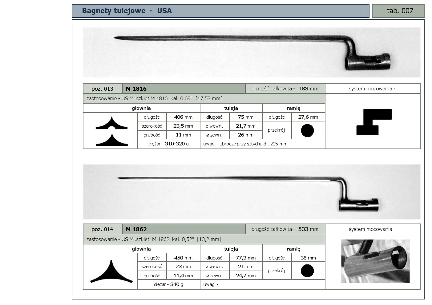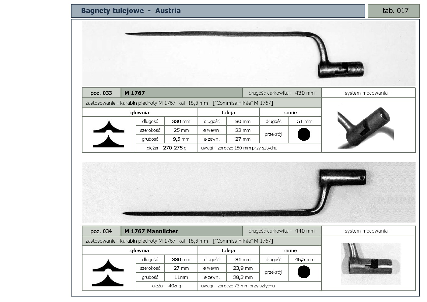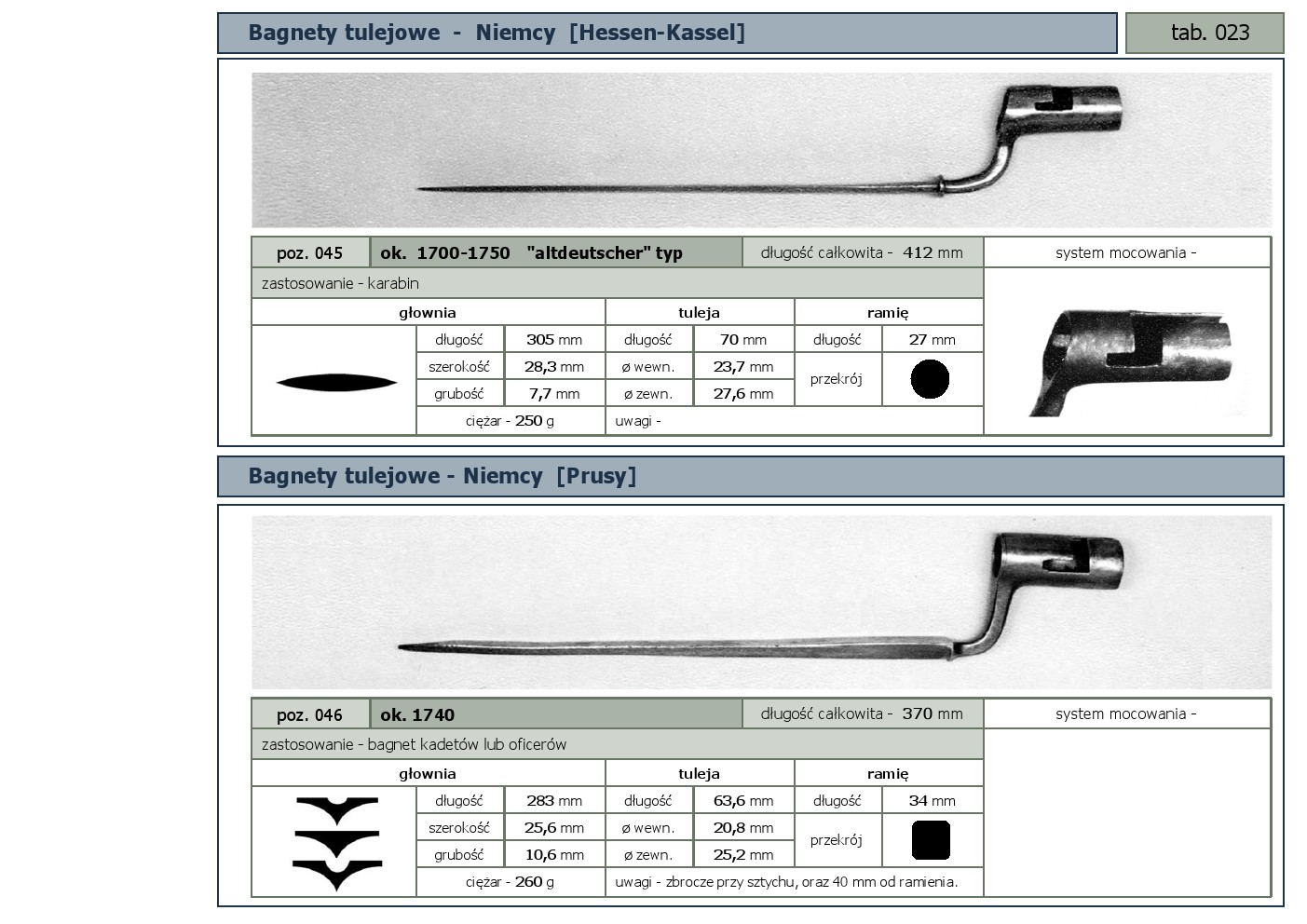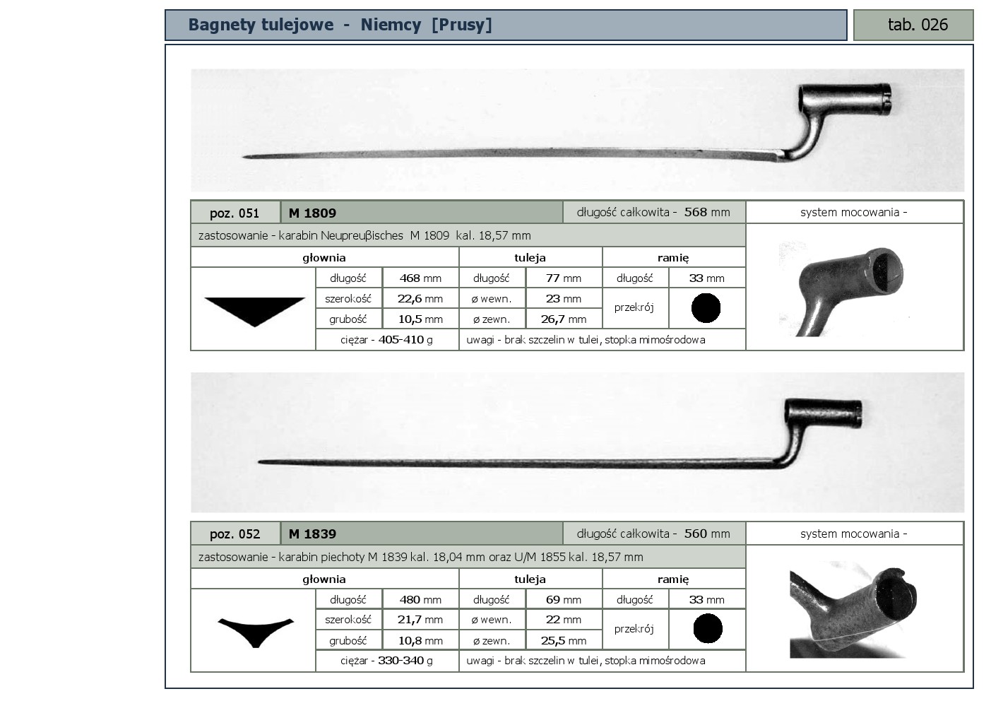 Tabele poglądowe bagnetów konstrukcji mocowania typu - tulejowego