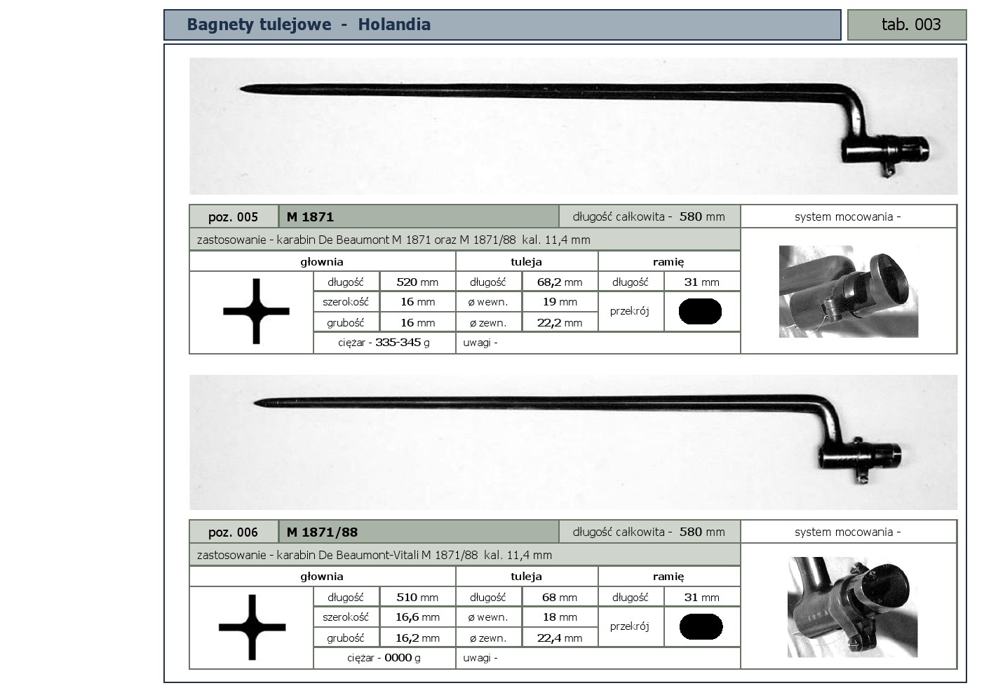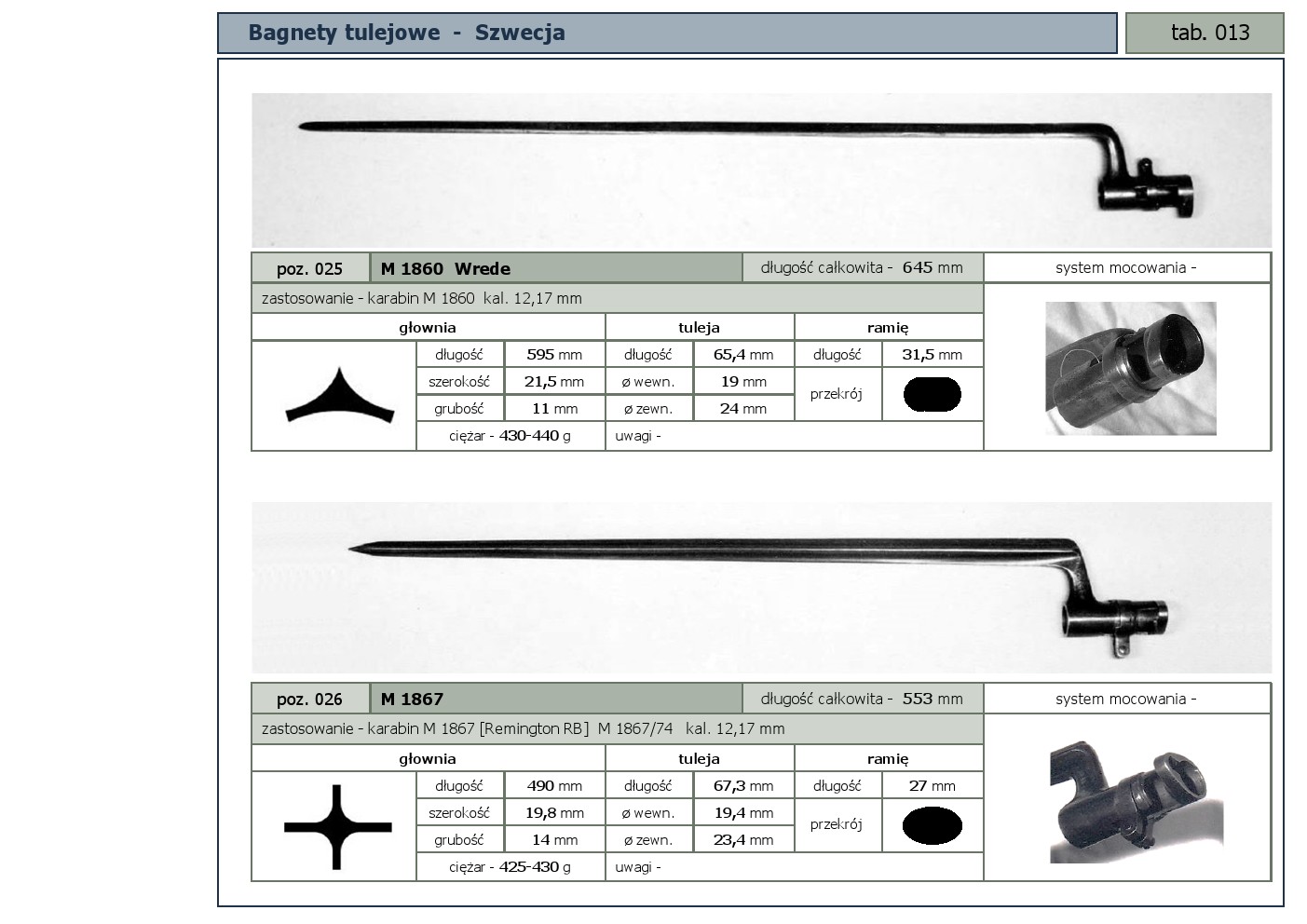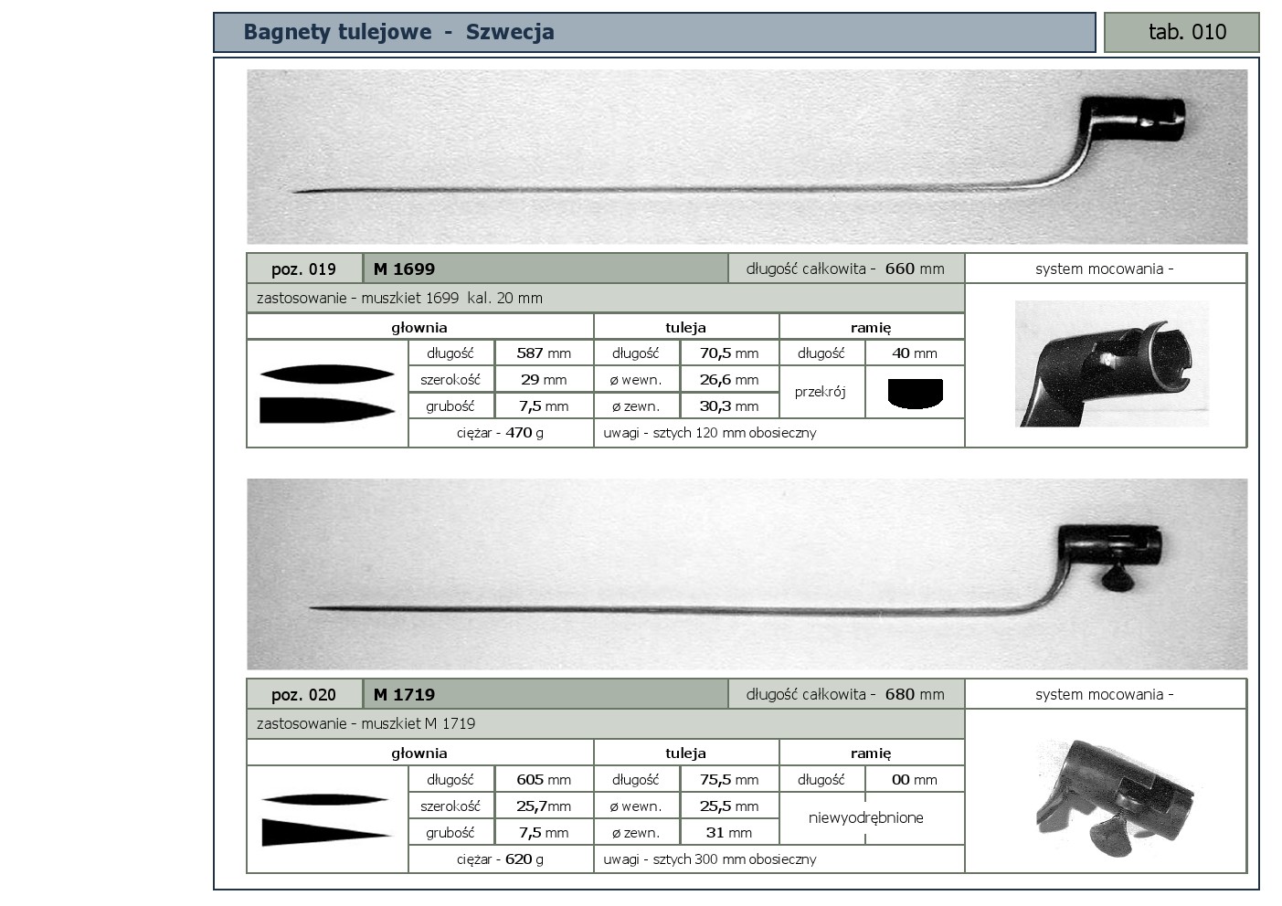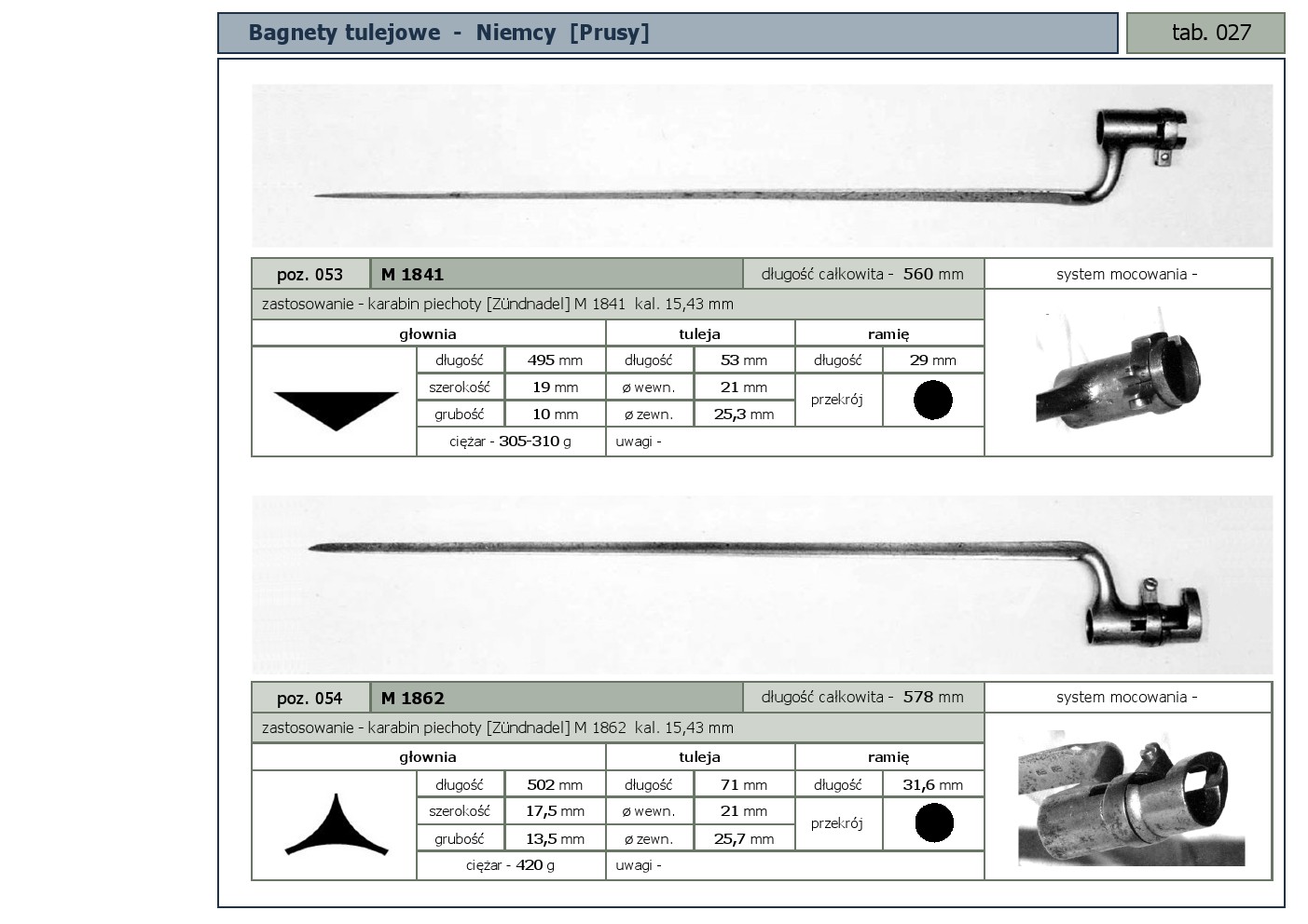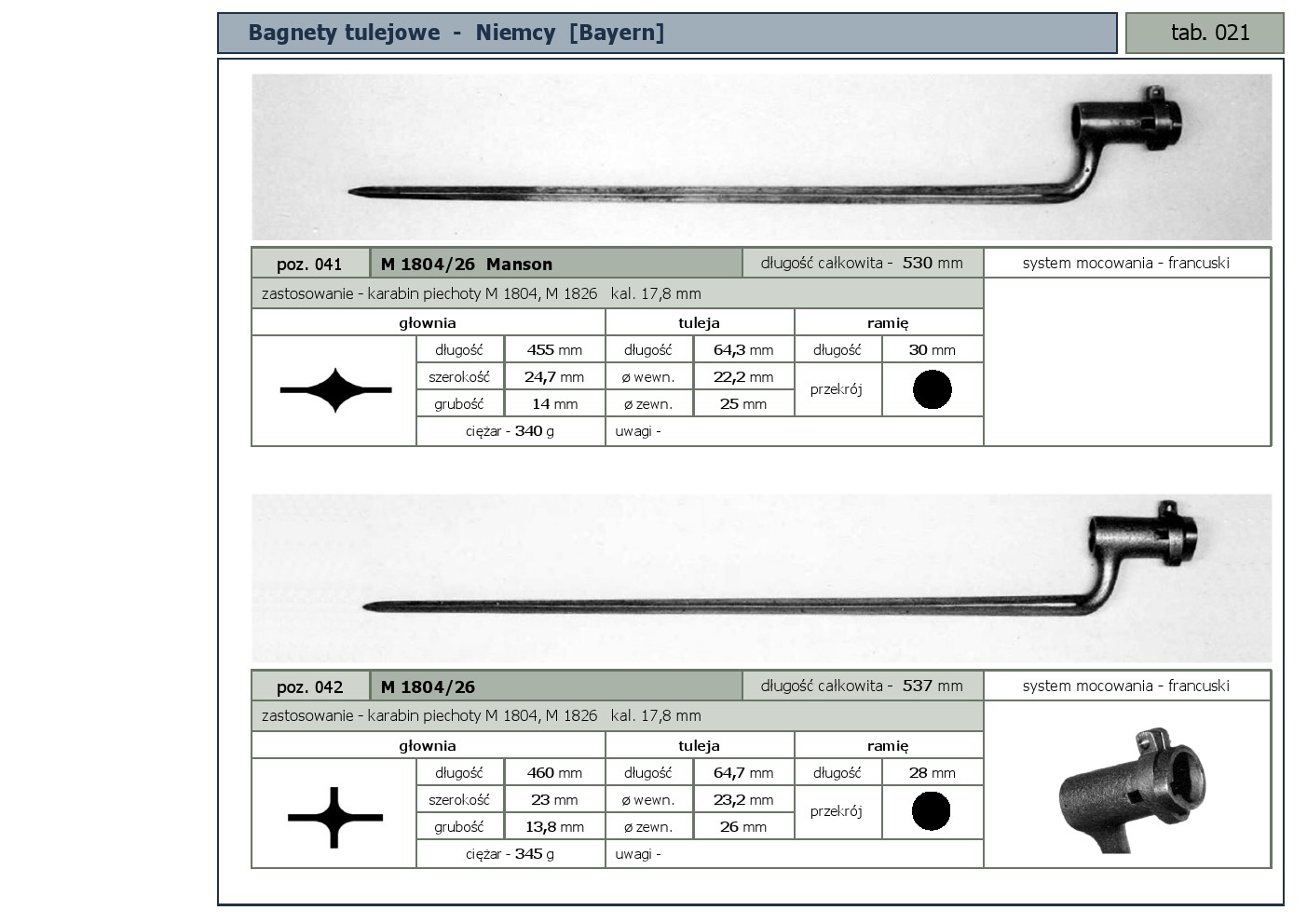 Tabele poglądowe bagnetów konstrukcji mocowania typu - tulejowego