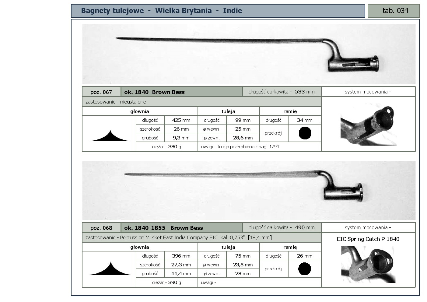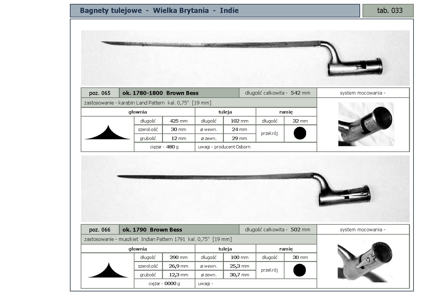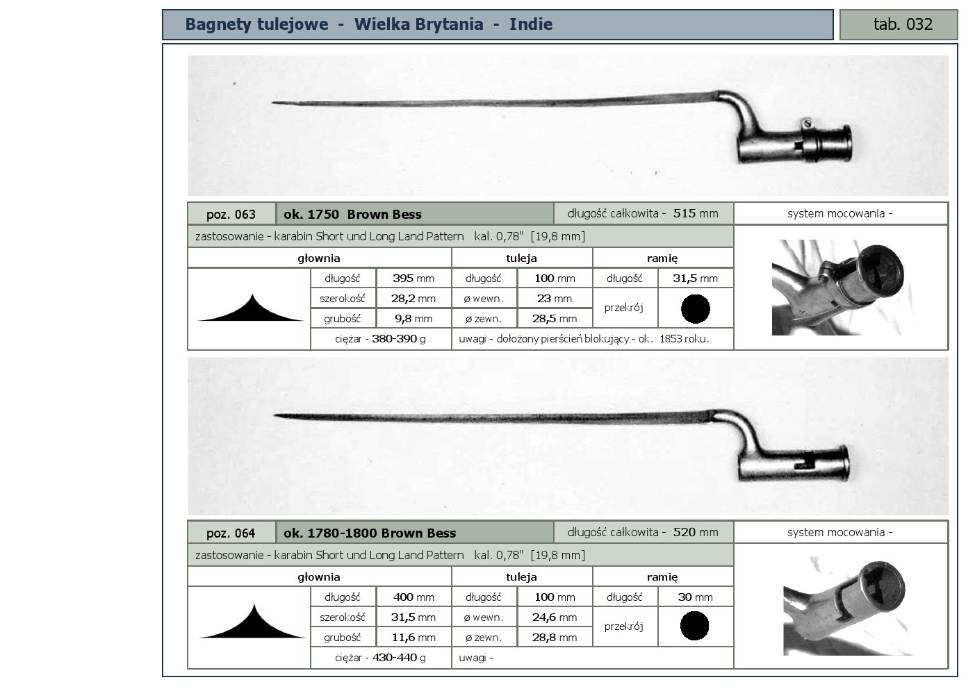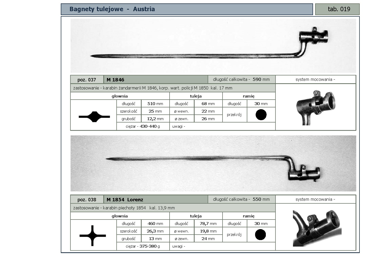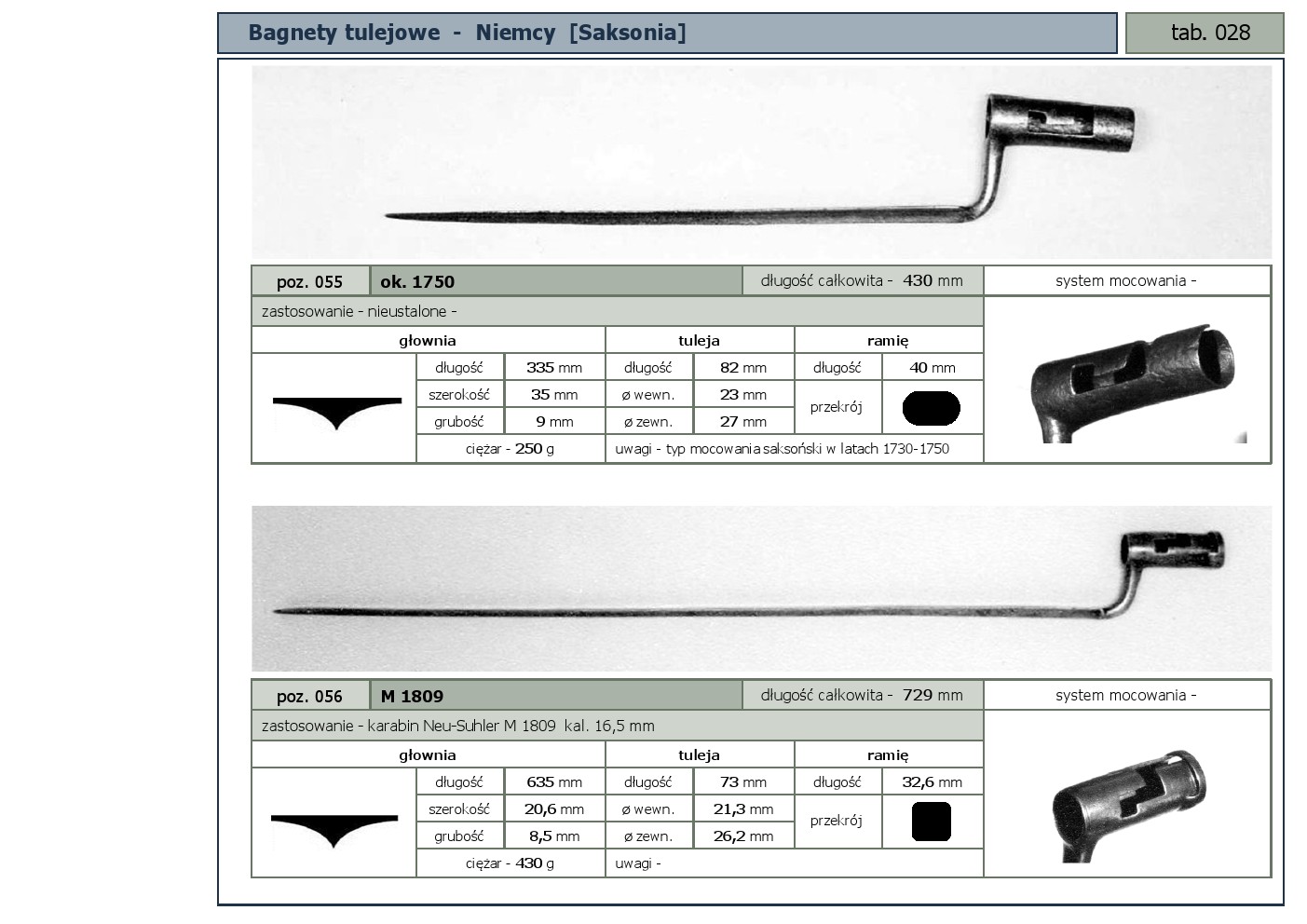 Tabele poglądowe bagnetów konstrukcji mocowania typu - tulejowego