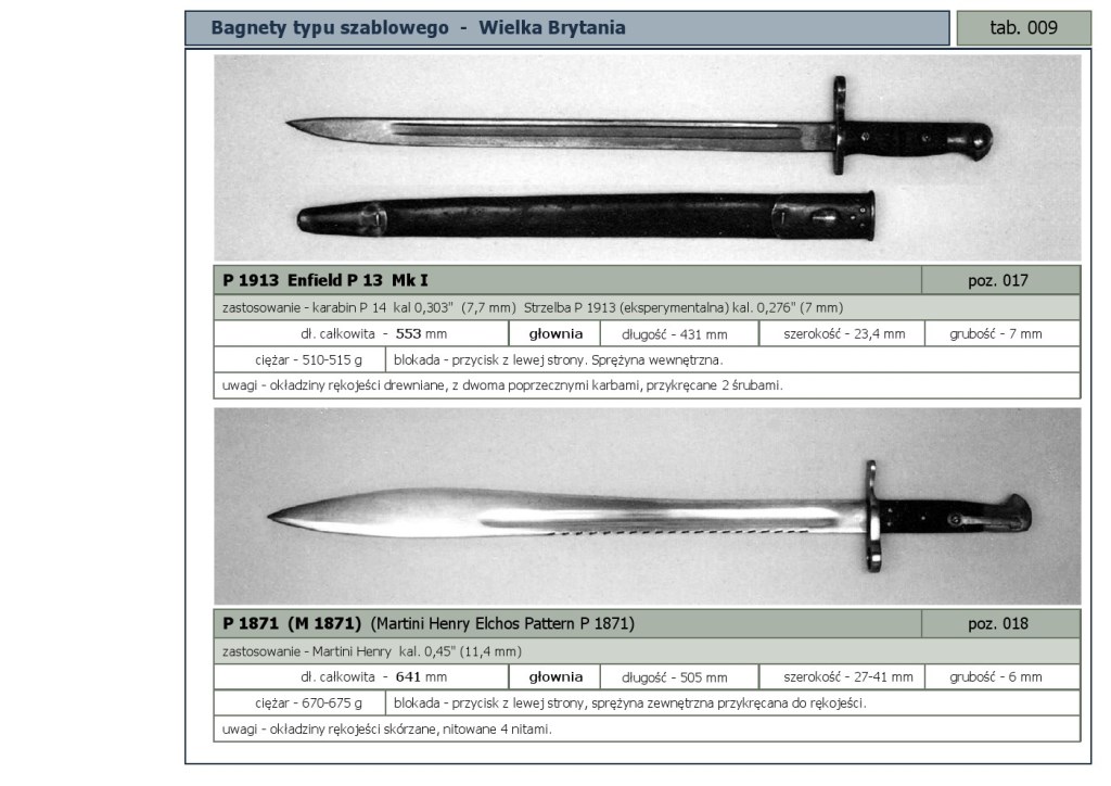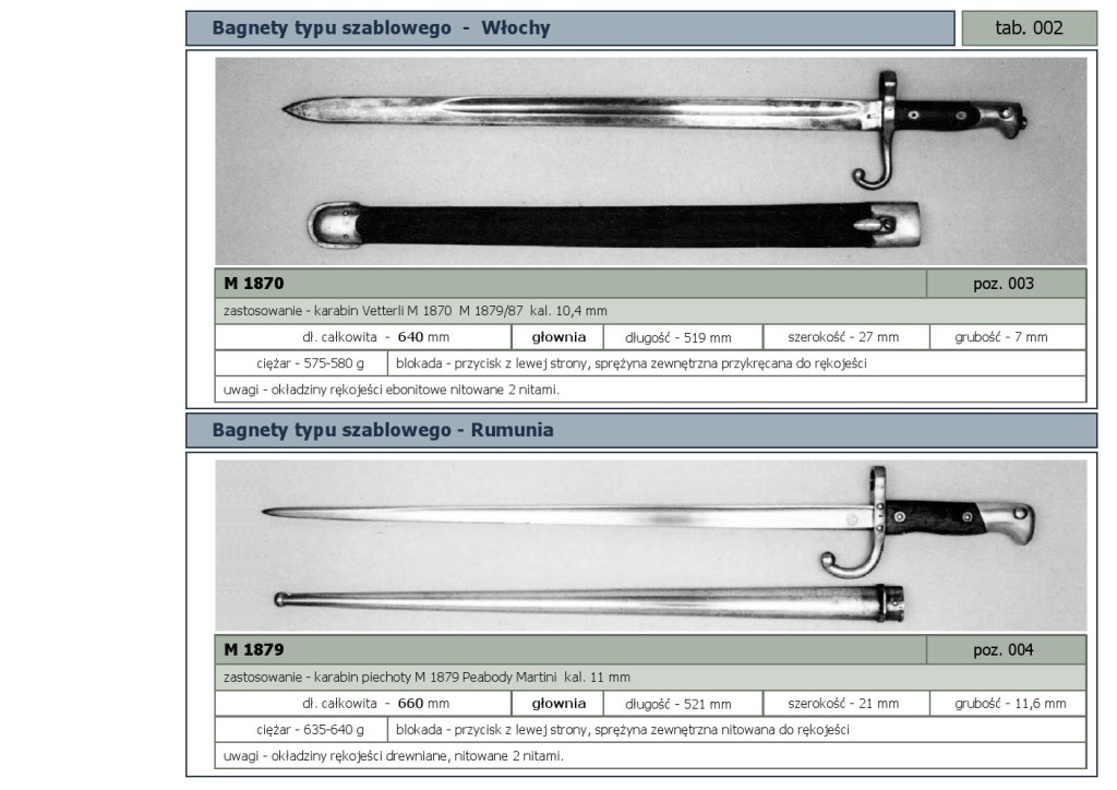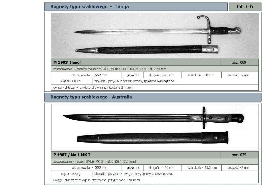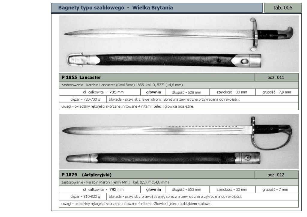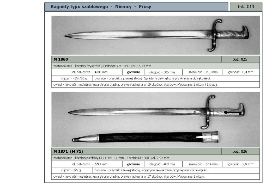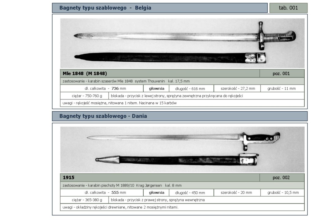Tabele poglądowe bagnetów konstrukcji typu - szablowego