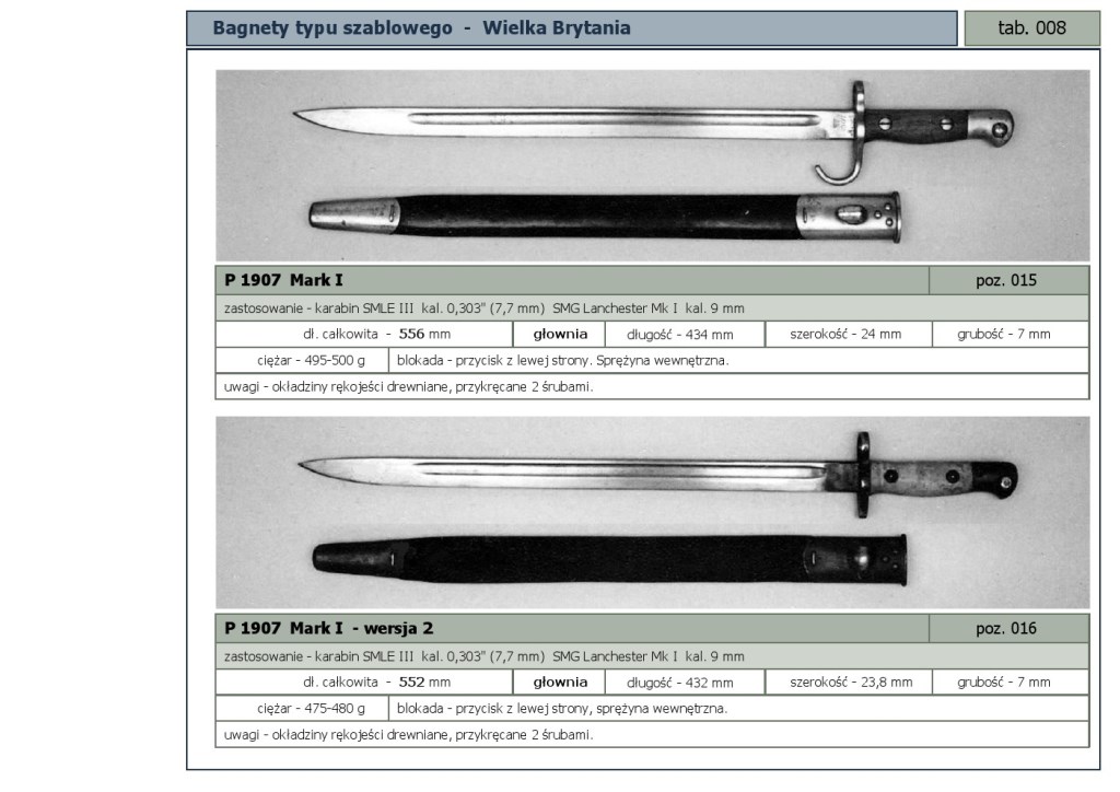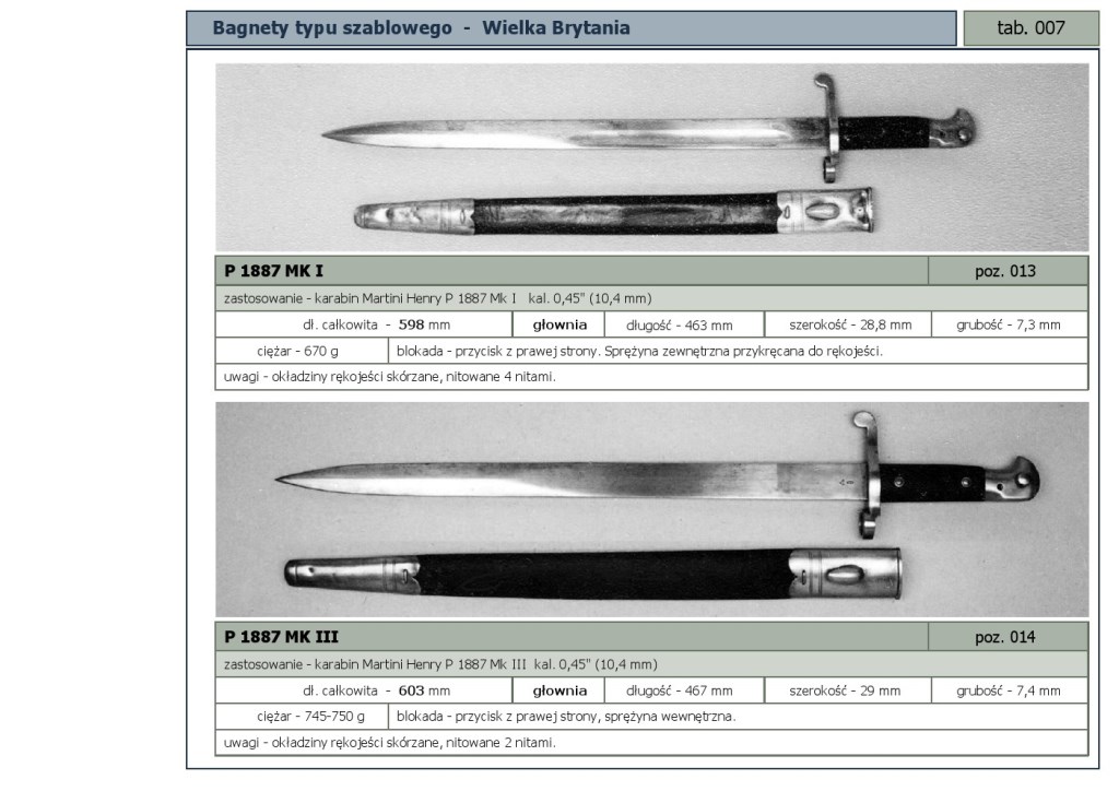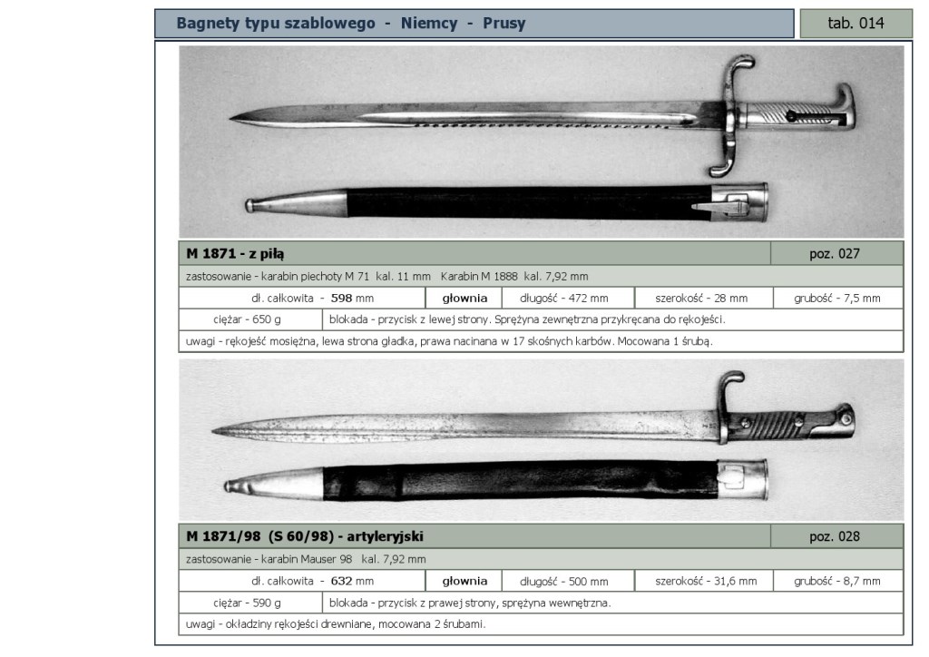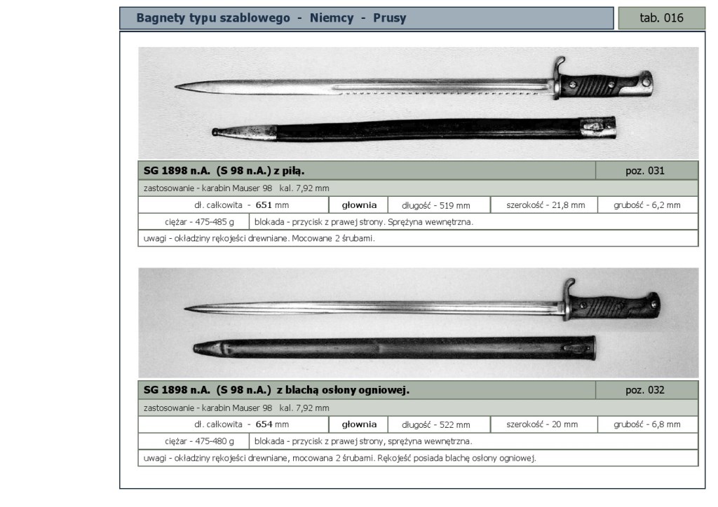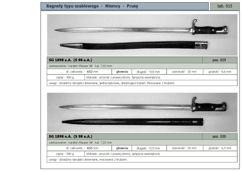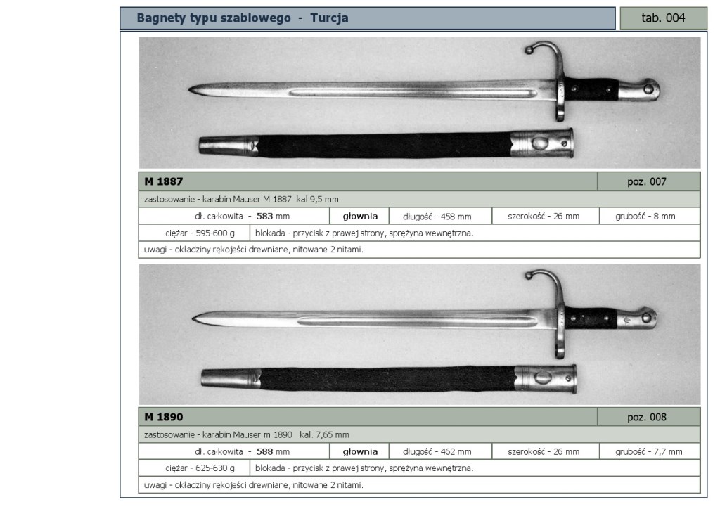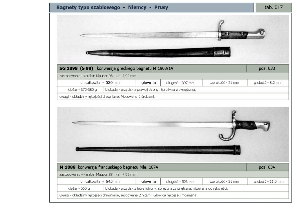 Tabele poglądowe bagnetów konstrukcji typu - szablowego