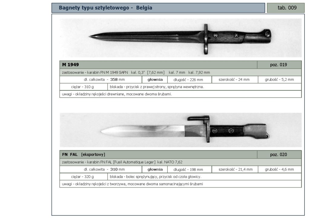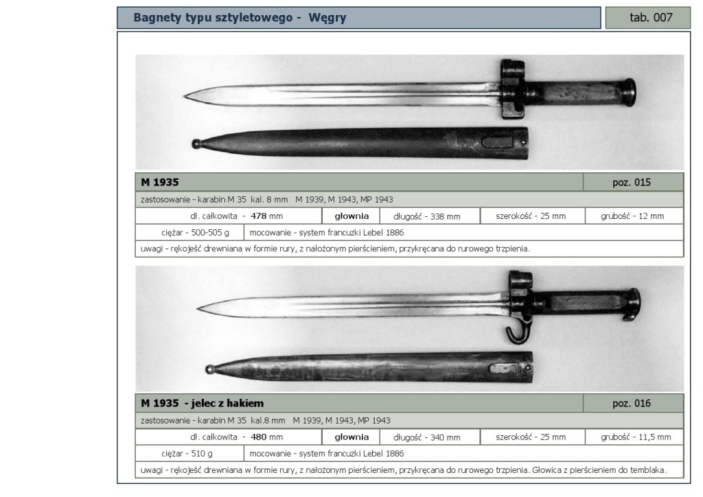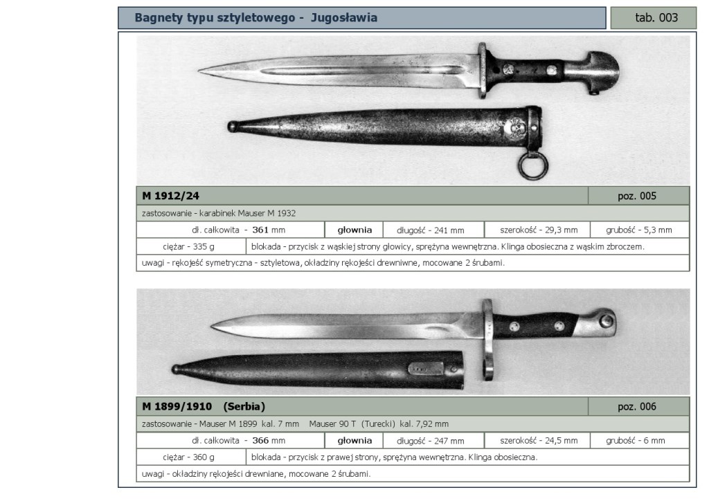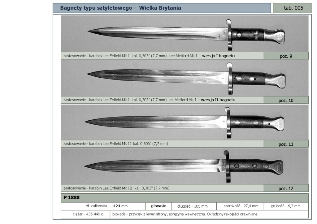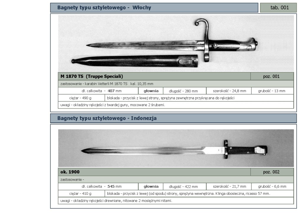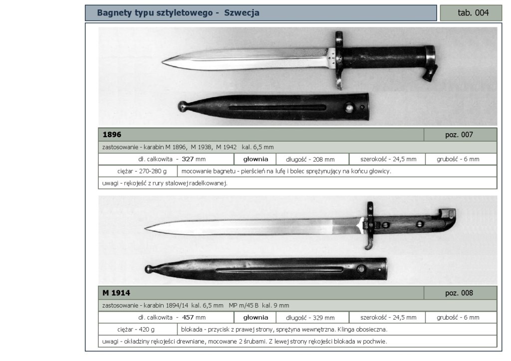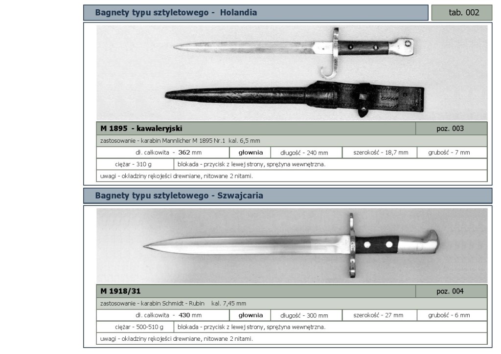 Tabele poglądowe bagnetów konstrukcji głowni typu - sztyletowego