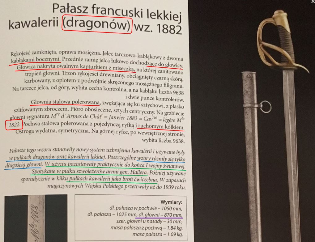 "...Pałasz francuski lekkiej kawalerii (dragonów) wz.1882".........w istocie jest to pałasz francuski kawaleryjski. Należało by napisać