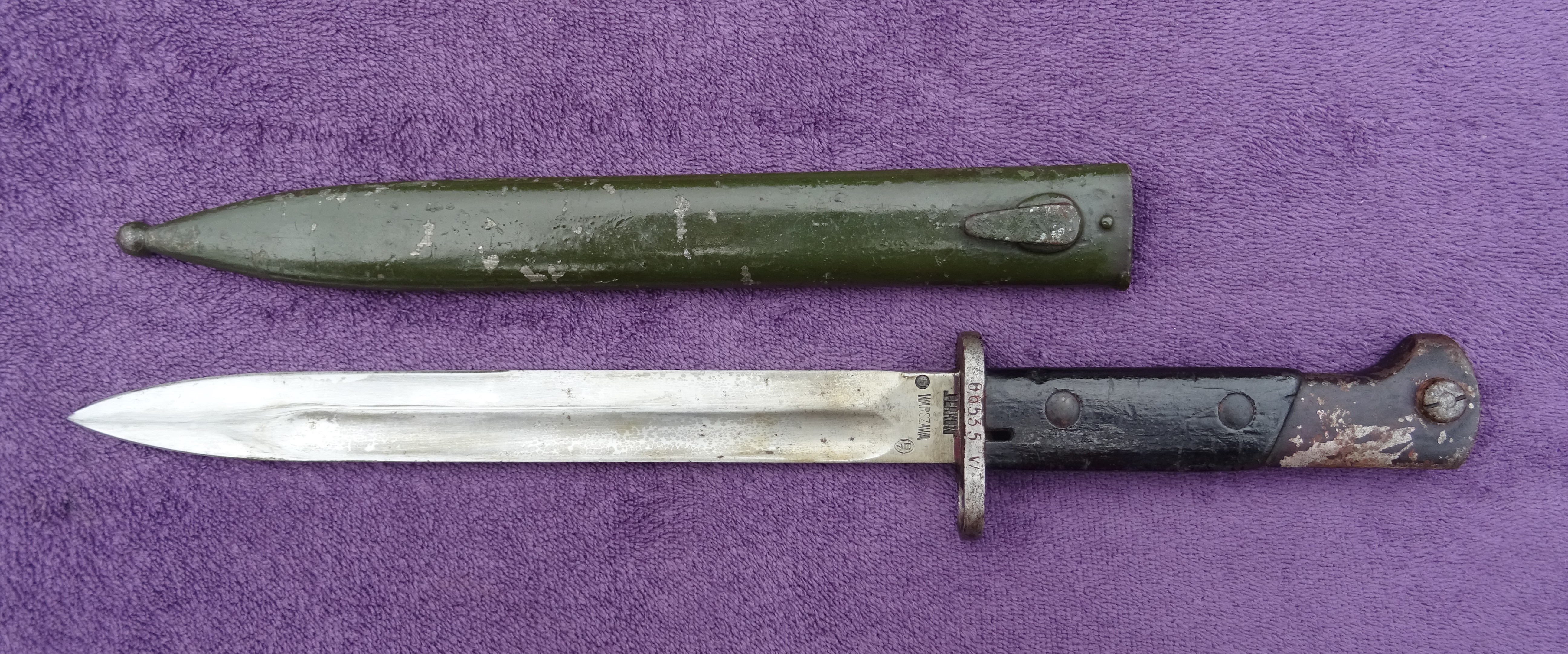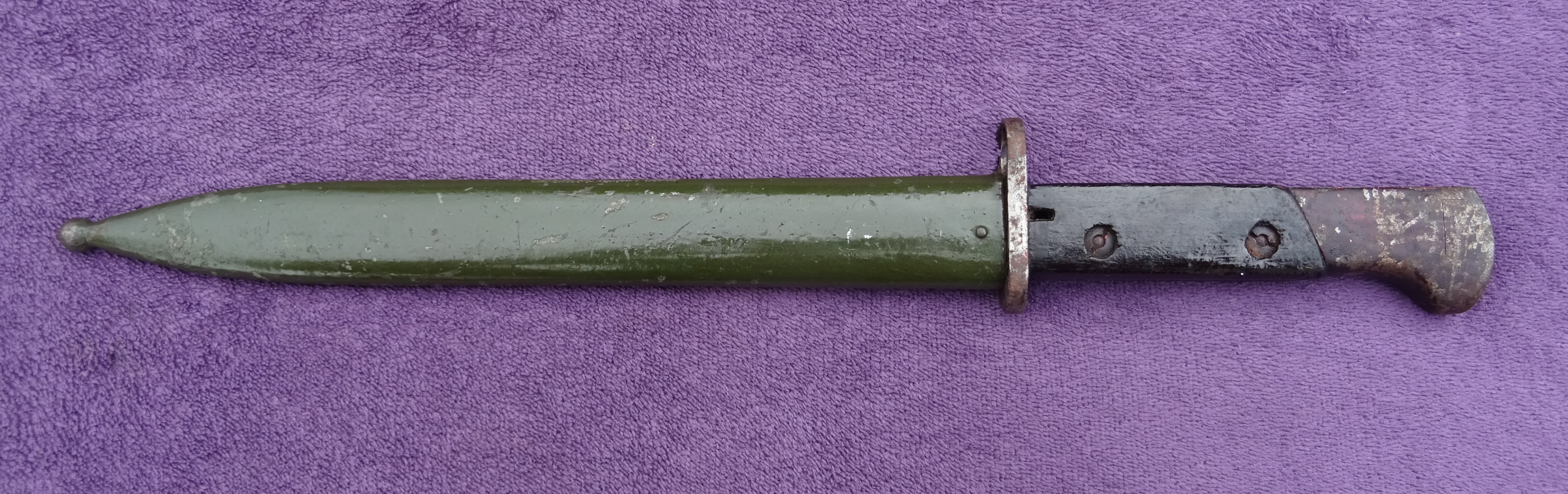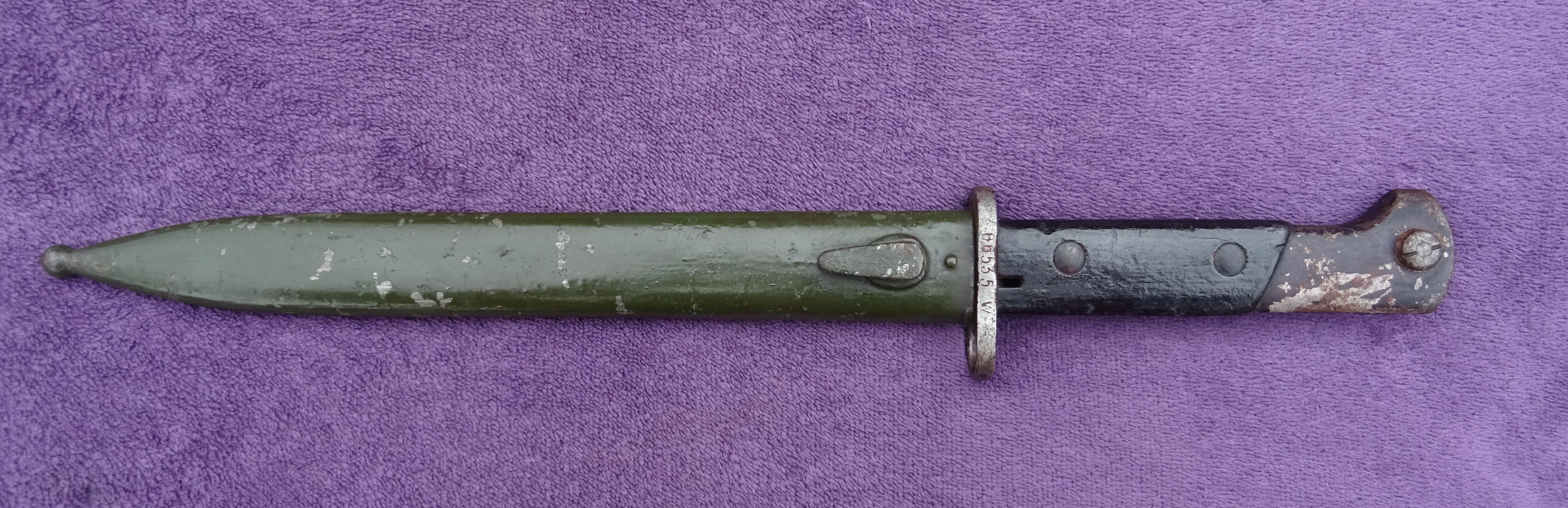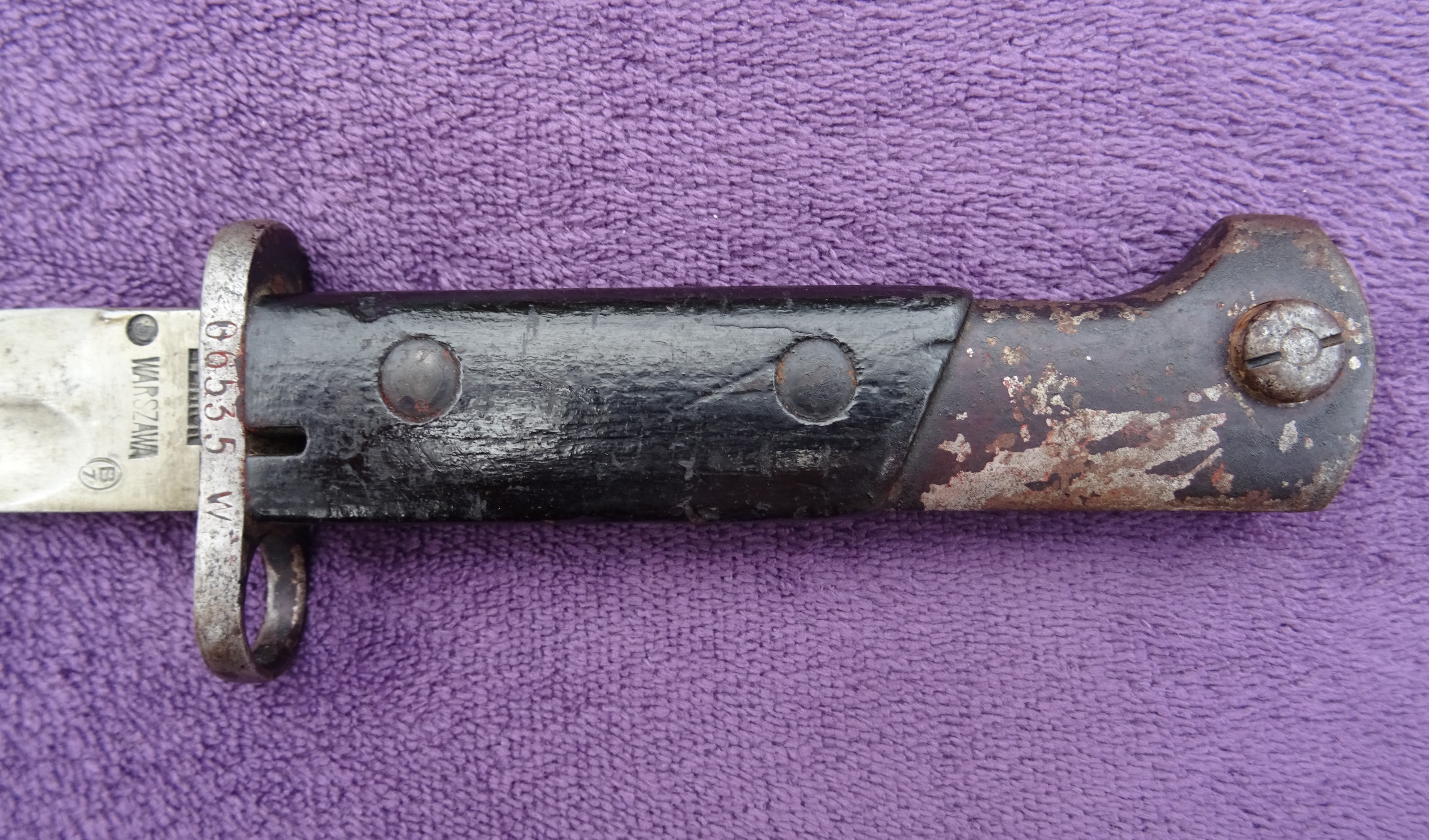 Pochwalę się nową zdobyczą - warszawskim z datą 1939. Bagnet jest zapaskudzony przez domorosłego konserwatora amatora. Trzeba będzie nad nim trochę popracować. Szelak z głowicy to drobnostka, olejna z okładek też raczej powinna być do usunięcia bez problemu. Martwi mnie tylko farba na pochwie. Jeśli pod spodem jest oryginalna polska zieleń to chciałbym ją zachować, tylko jeszcze nie wiem jak. Muszę dopytać znajomego konserwatora. A może ktoś ma jakiś patent?