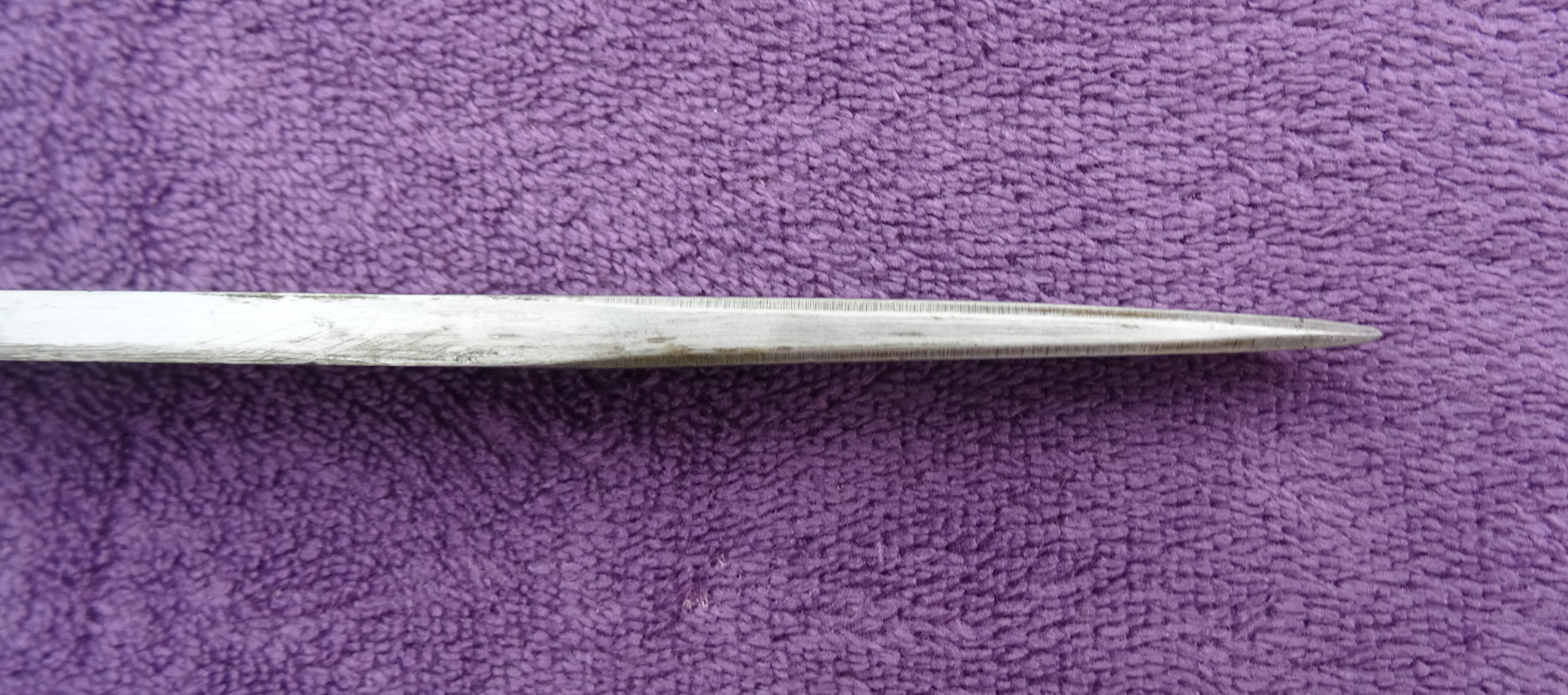 Generalnie stan głowni doskonały, choć jeszcze nieco brudny. Wszystko jak należy, piękne sygnatury, seria "W", czernione śruby, okładki wyraźnie większe, pochwa schyłkowa warszawska z dwoma nitami, odbiór wojskowy "B7" + stempel techniczy "5", charakterystyczny szlif sztychu od grzbietowej strony + "anty kucharskie" ostrzenie głowni z tępą częścią przy nasadzie.