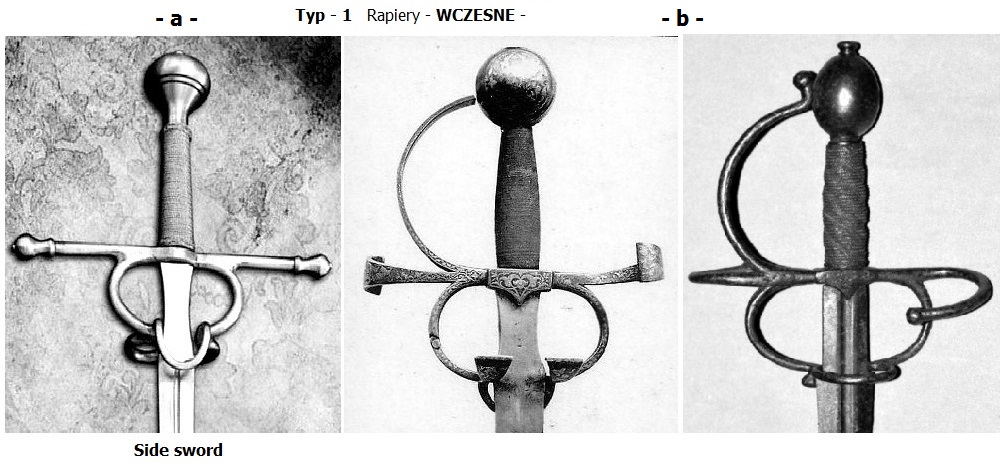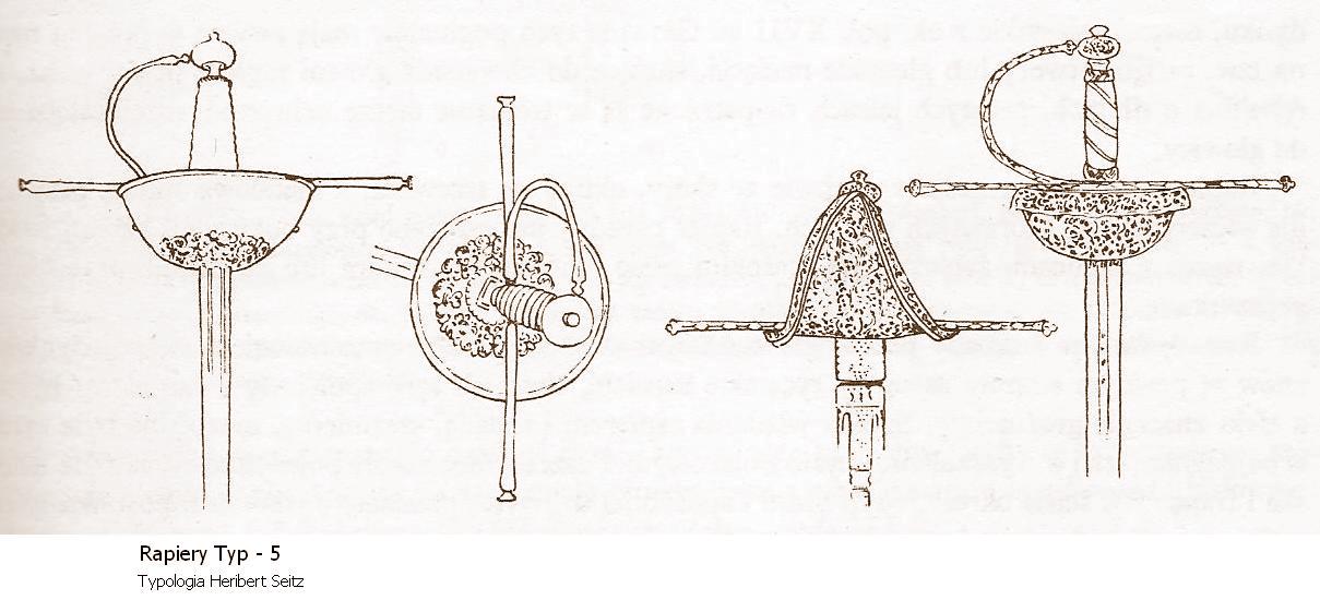 „…Rapiery o rękojeści krzyżowej, odmiana niderlandzko-szwedzka….najbardziej spokrewnione z mieczami. Miały one głowice owoidalne lub spłaszczone sercowate, z oślą podkową lub bocznym pierścieniem, czasem po prostu z paluchem. Do tej klasy Seitz zaliczył również rapiery z bocznym kabłąkiem”.