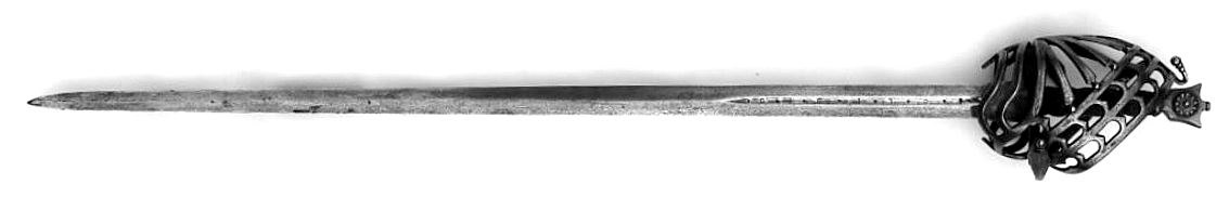 „….Kolejny typ nosi nazwę rapiera koszowego i charakteryzuje się głownią średniej długości (ok.80 cm; szer. u nasady 40-50 mm), zwykle ze zbroczami, rękojeść z całym systemem kabłąków i obłęków, tworzących pełną osłonę dla dłoni. Broń ta była wybitnie wojskowa, zarówno jazdy jak i piechoty......w Wenecji rozwinął się rapier koszowy tzw. schiavona”
