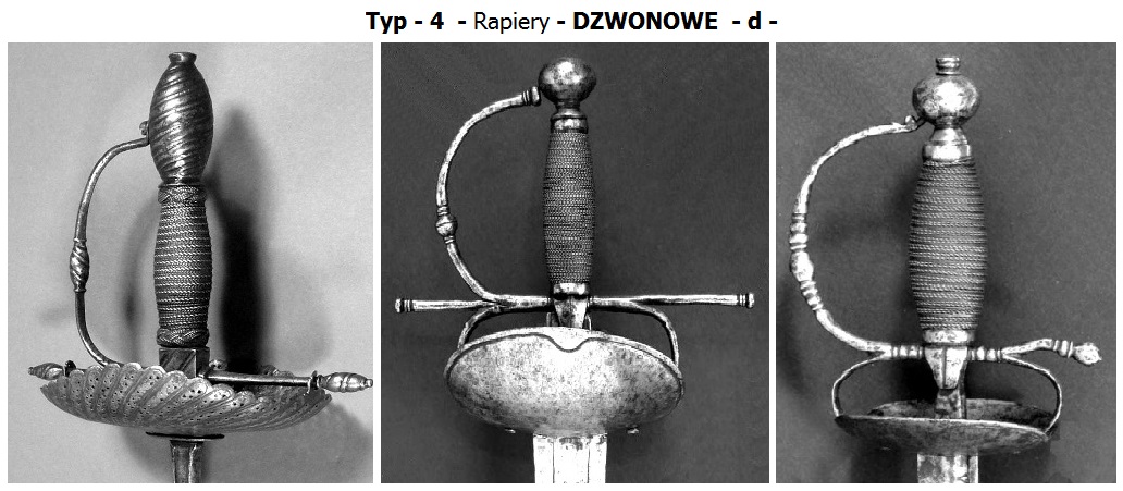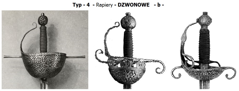 Typ – 5. W czwartym dziesięcioleciu XVII w. W Hiszpanii i Włoszech, rozpowszechnił się rapier z rękojeścią o głowicy owoidalnej lub kulistej (spłaszczonej), długim prostym jelcem z kabłąkiem, krótkim trzonem rękojeści i wydatną osłoną w kształcie czaszy (półkulistej), niekiedy ażurowej. Dla tych rapierów przyjęto nazwę „rapierów dzwonowych”. Do tego typu rapierów zaczęto stosować (w pojedynkach) puginały, do lewej ręki (zwane „lewakami”). Głownie tych puginałów, mają najczęściej w pobliżu nasady (na progu) otwory, lub głębokie nacięcia, służące do chwytania głowni rapiera przeciwnika. Rękojeść o długim prostym jelcu z osłoną w formie trójkątnej tarczy, dochodzącej do głowicy.