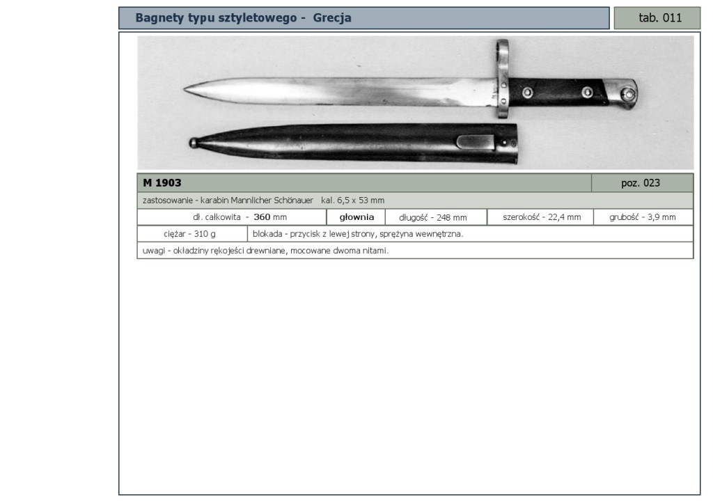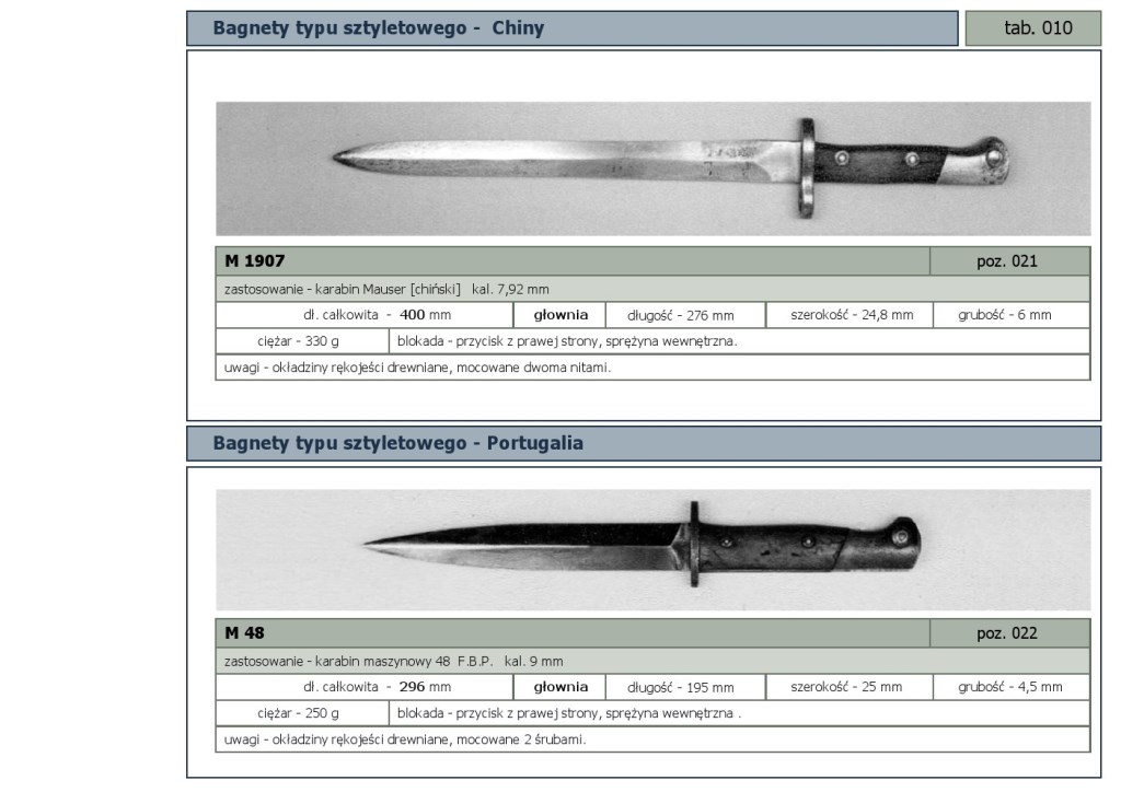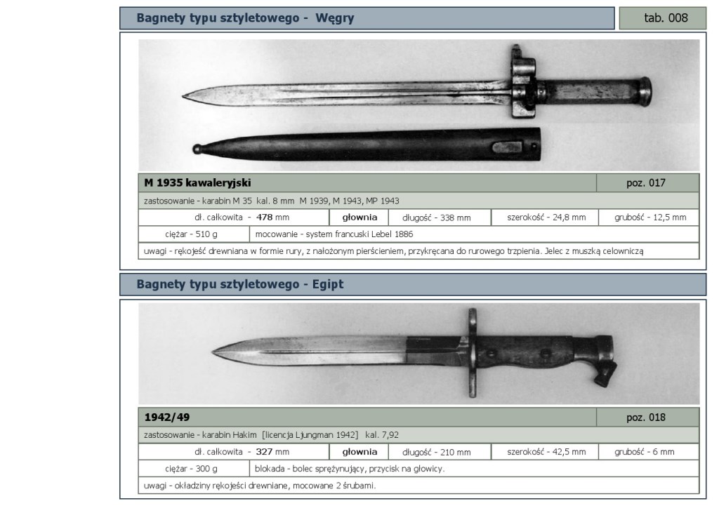 Tabele poglądowe bagnetów konstrukcji głowni typu - sztyletowego
